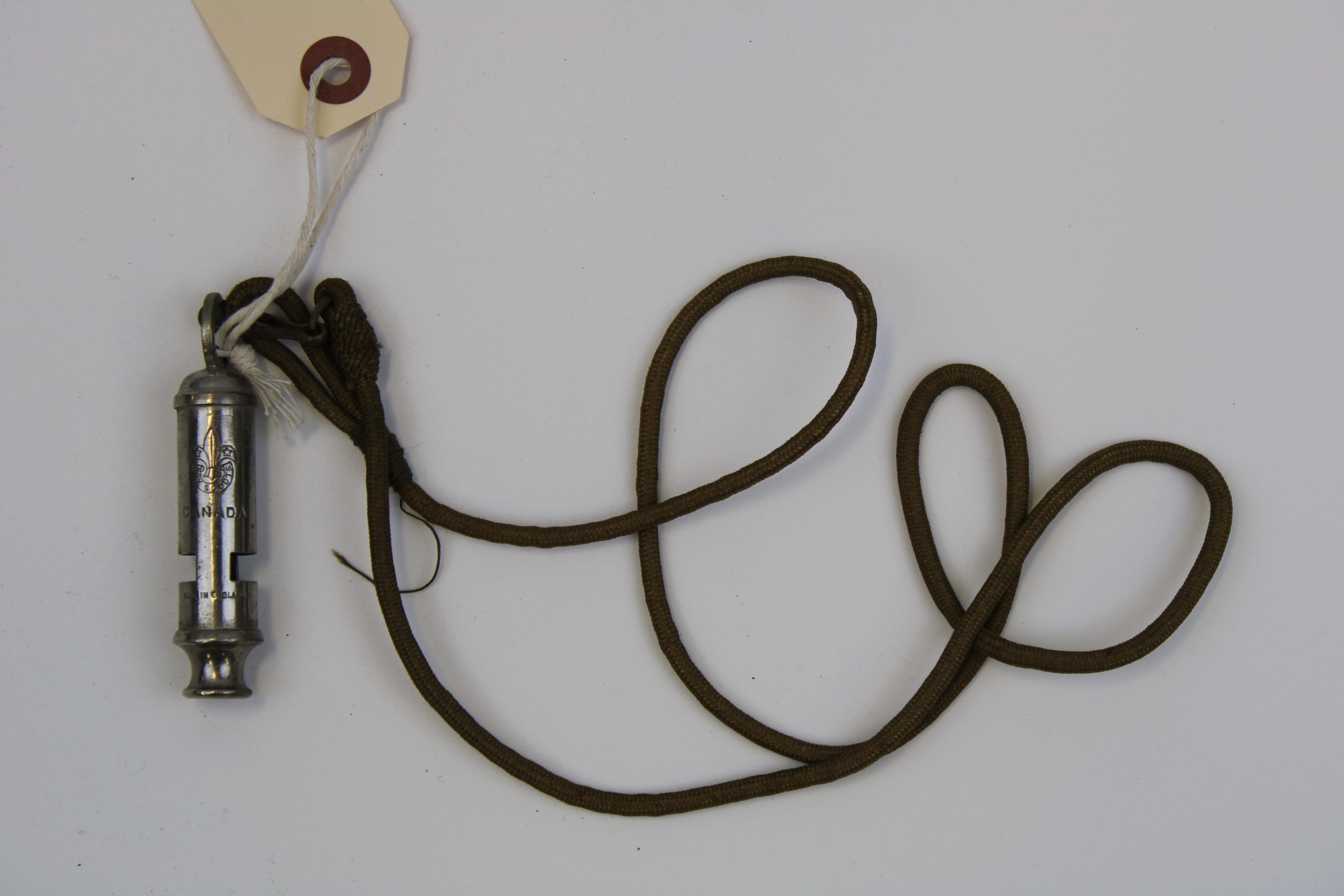 Polished nickel-plated brass whistle with brown braided cord lanyard. The body is cylindrical with slotted sides and a rounded mouthpiece. The whistle