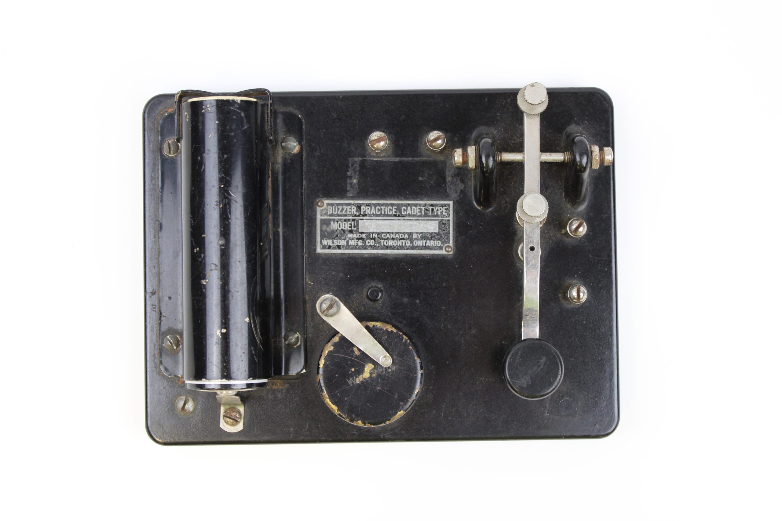 Rectangular black metal practice buzzer mounted on a hard baseplate with a manual Morse code key and an electric coil assembly. The unit features a kn