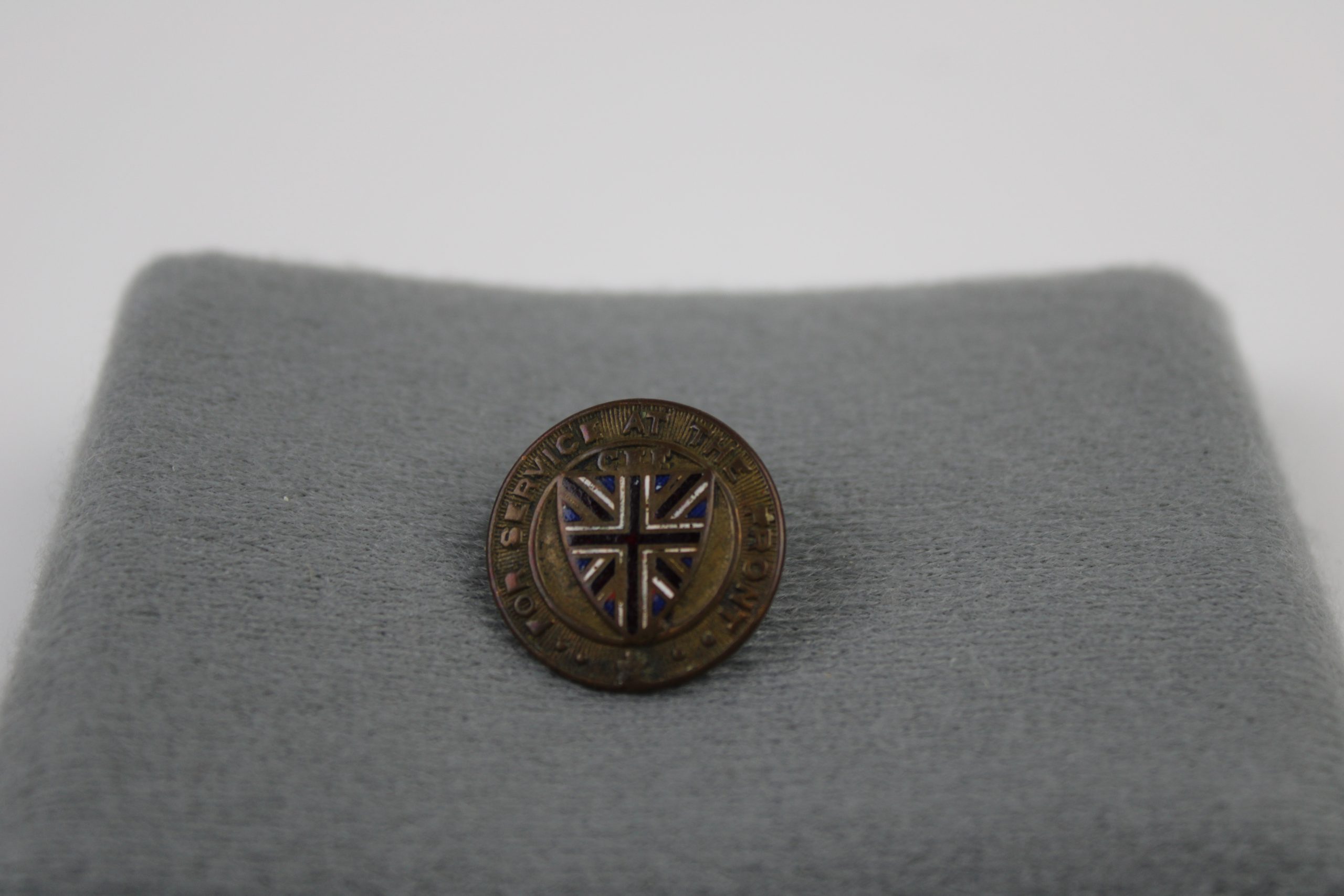 A bronze circular badge with enamelled Union Jack in the shape of a Tudor shield, issued to members of the Canadian Expeditionary Force (C.E.F.) who h