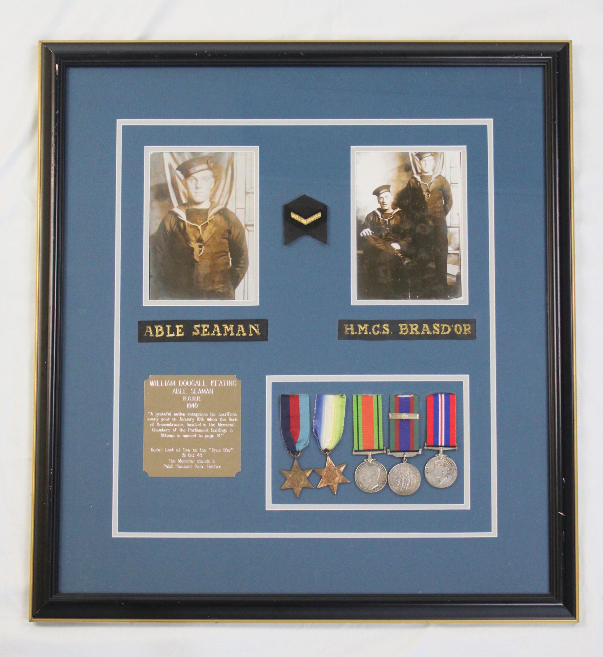 Framed commemorative display dedicated to Able Seaman William Dorsal Keating, who served aboard H.M.C.S. Bras d’Or during the Second World War. The