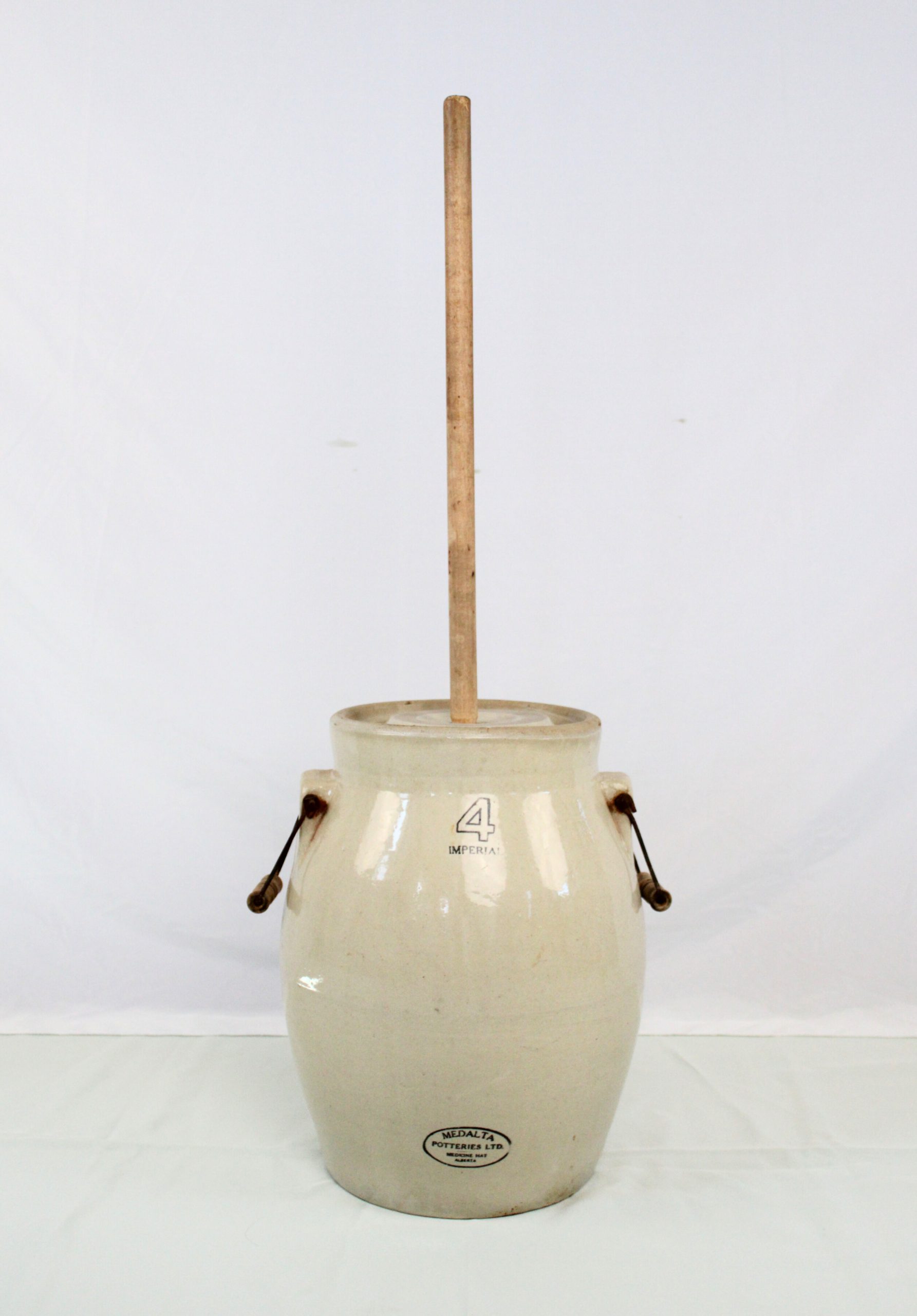 A four-imperial-gallon stoneware butter churn with accompanying wooden dasher. The churn is cylindrical with a rounded shoulder and straight sides, fi
