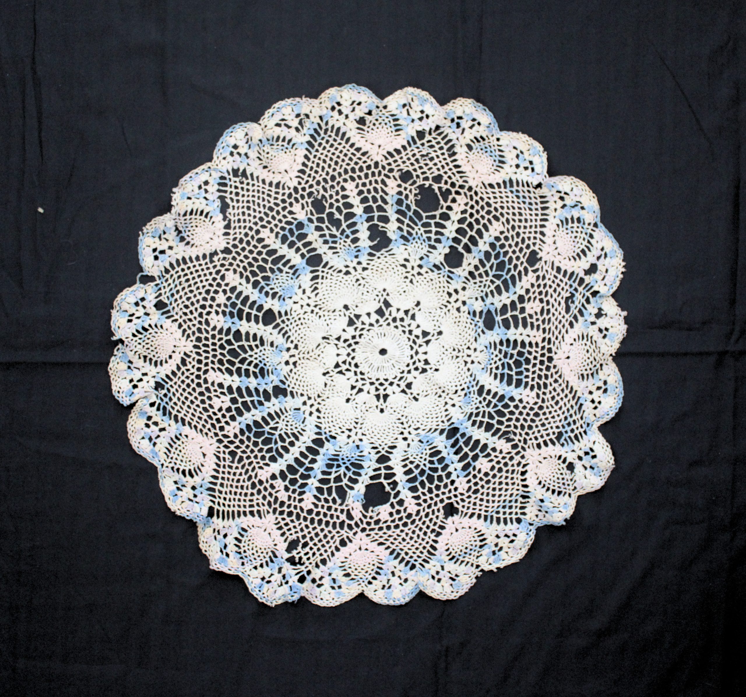 A round crocheted lace doily featuring a classic pineapple motif at its center, radiating outward into an intricate openwork design. The doily is made