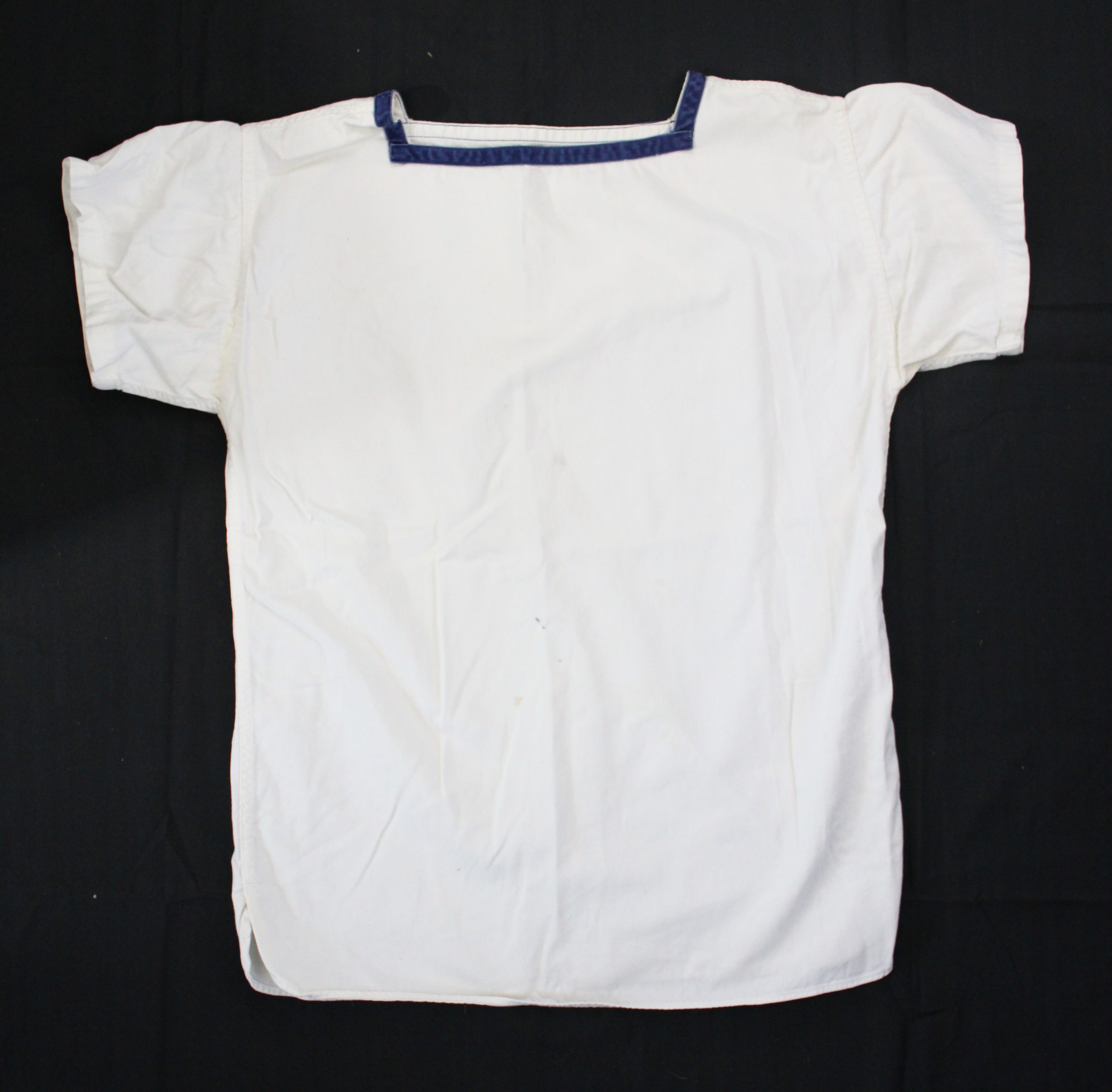 White short-sleeved cotton undershirt with a square neckline trimmed in blue. The shirt is plain and unadorned, with no buttons or insignia, designed