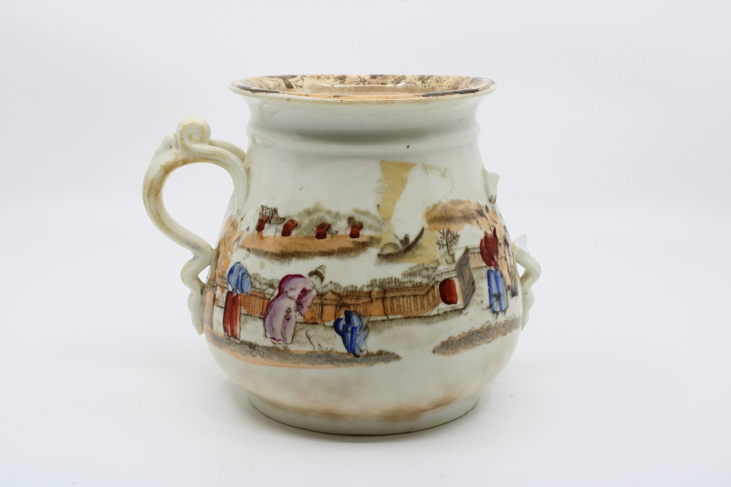 Hand-painted ceramic sugar dish with two ornate side handles and a flared rim. The body depicts a pastoral scene of figures in colorful attire (red, b