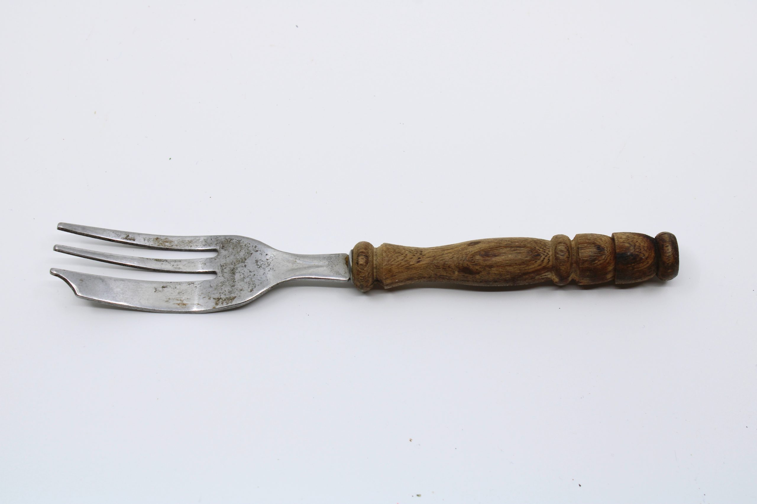 Metal three-tined fork with a turned wooden handle. The fork end is made of stainless steel or plated iron, slightly curved and featuring three wide p