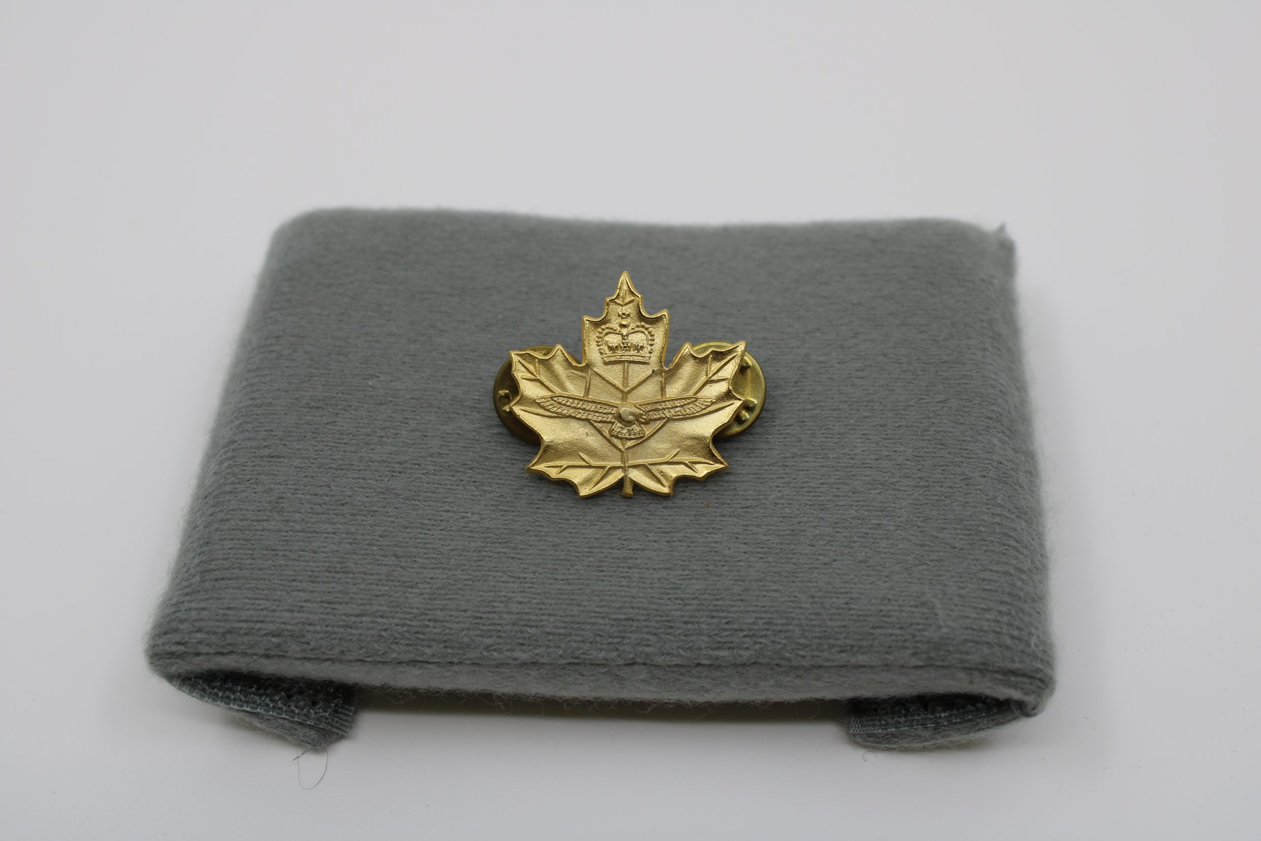 Small gold-coloured metal collar badge in the shape of a maple leaf, featuring a spread-winged bird (symbol of the Canadian Forces) surmounted by a St