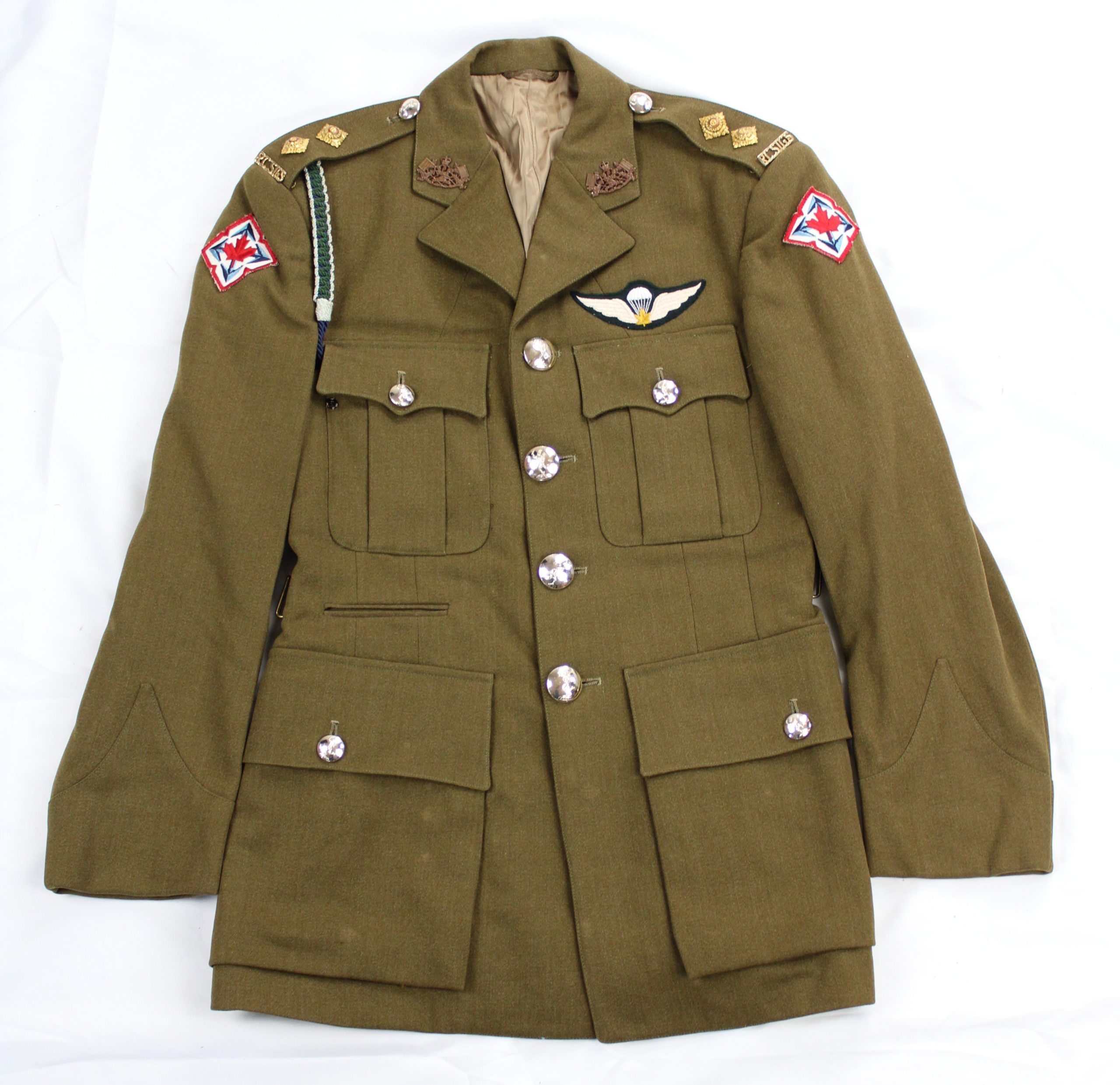 Olive drab wool service tunic featuring four silver-coloured metal buttons down the front, each embossed with the figure of Mercury, emblem of the Roy