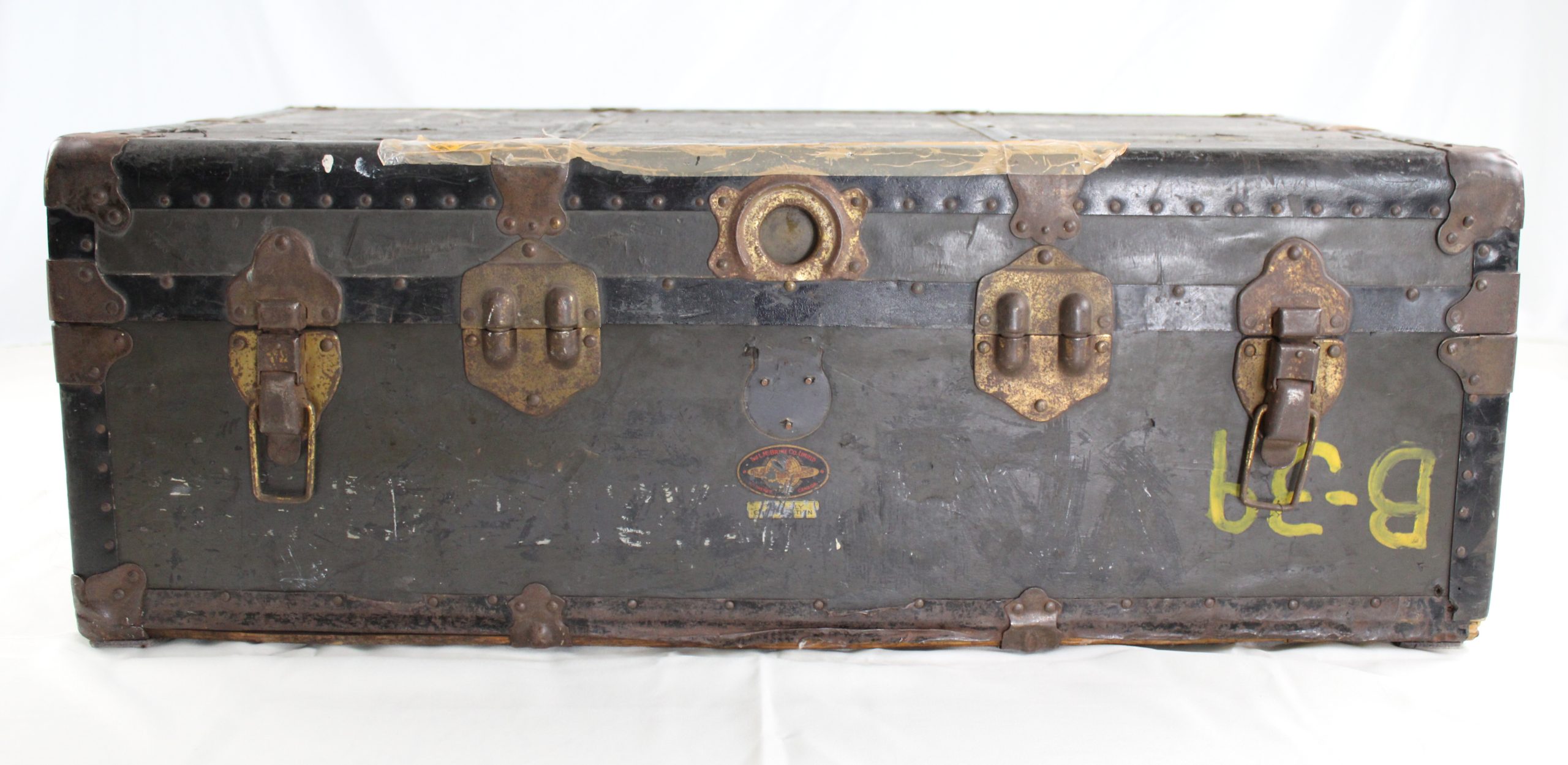 A black-painted military trunk constructed of wood reinforced with metal bands, rivets, and corner plates, used for the transport of a soldier’s per