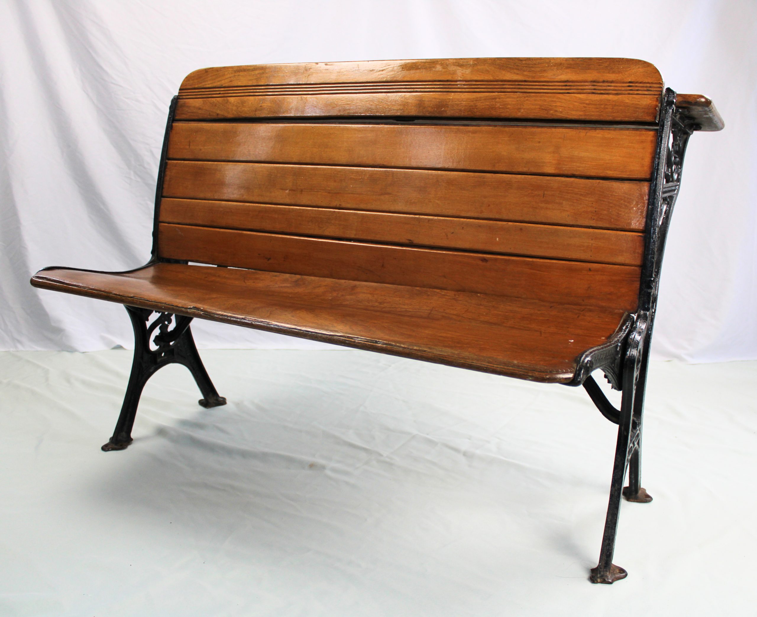 Bench-style wood and cast iron school desk designed for two students. The seat and desktop are made of varnished slatted wood, with decorative cast ir