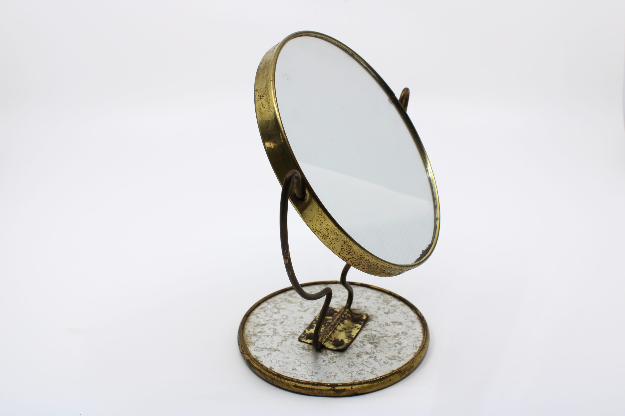 Circular tabletop mirror with a brass or brass-plated metal frame and stand. The mirror is mounted on a pivoting arm that allows for angle adjustment.