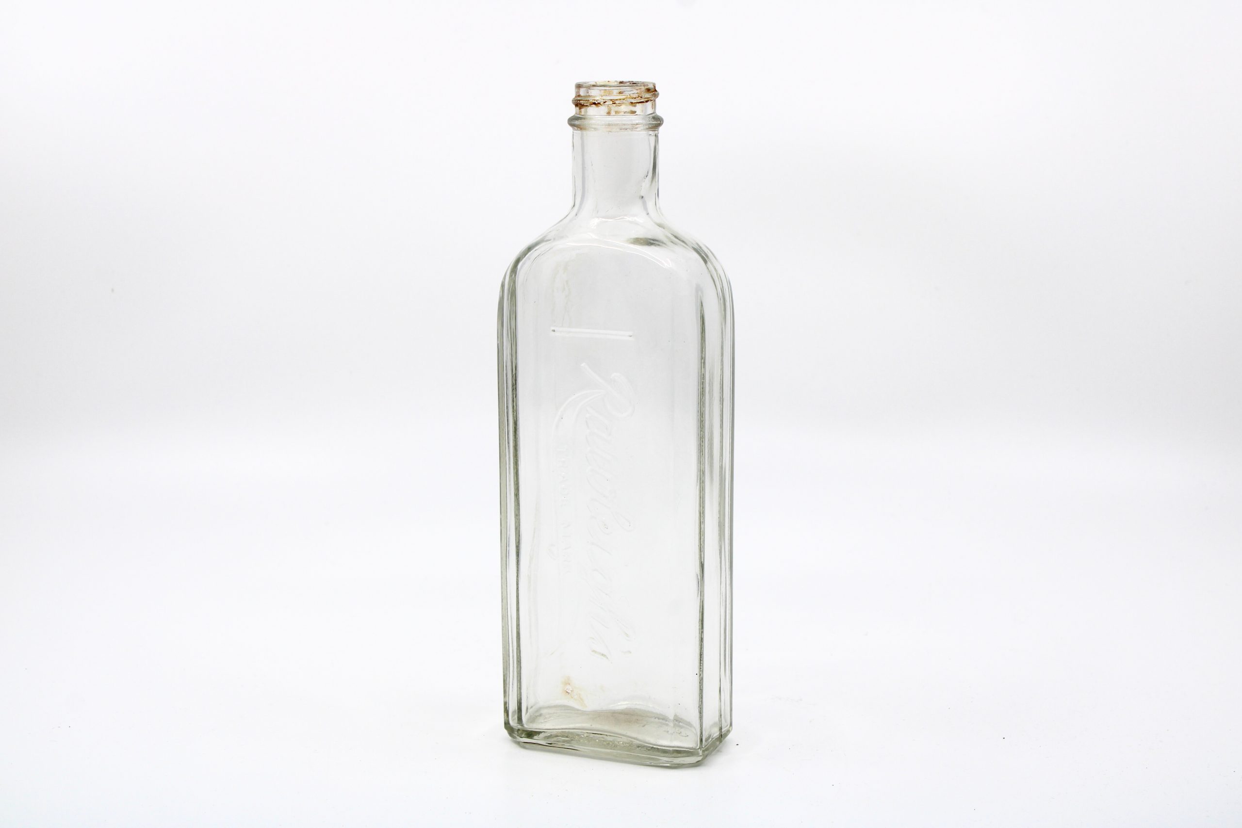Clear rectangular glass bottle with beveled edges and sloping shoulders.
