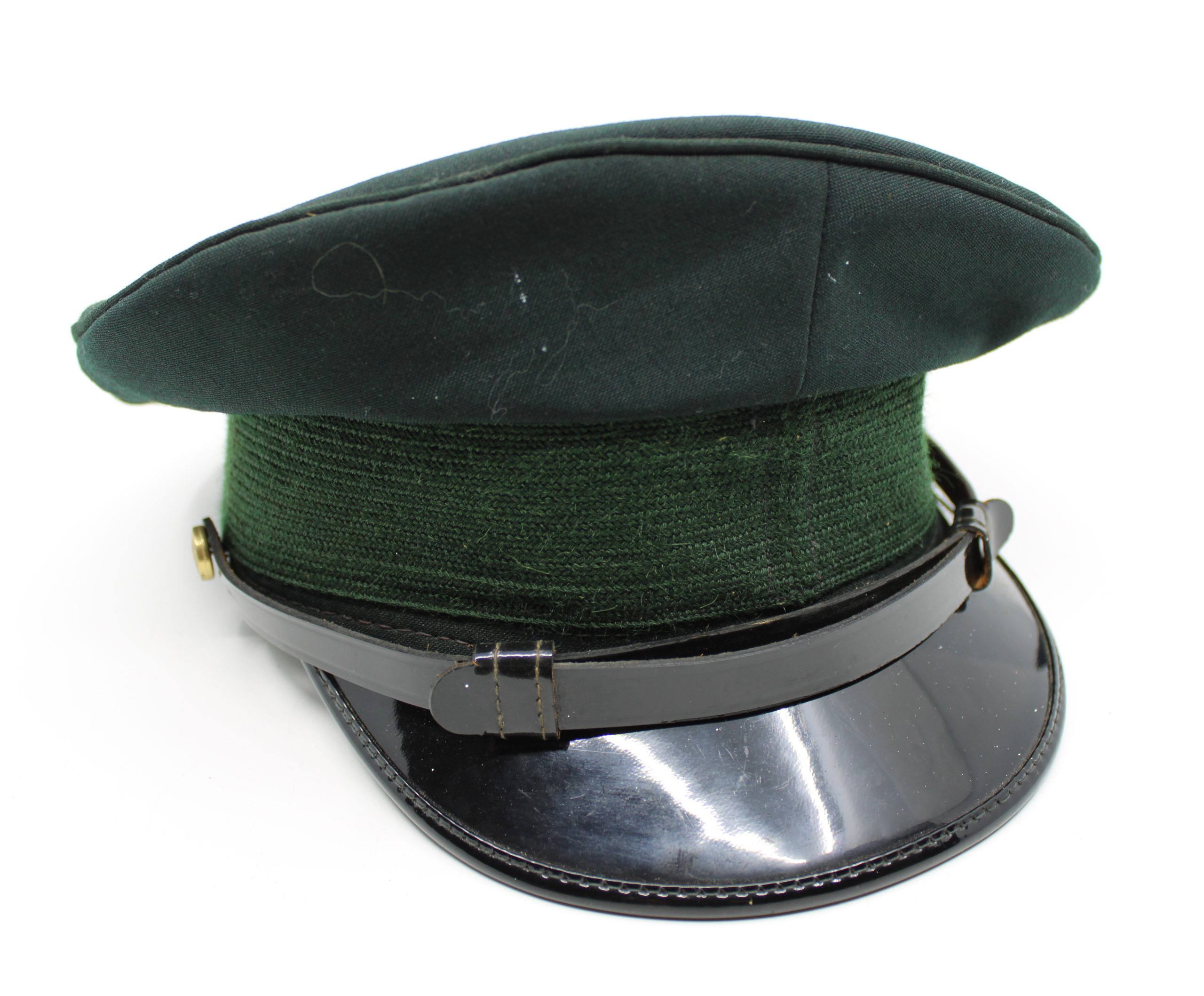Imperial German naval officer’s peaked cap made of dark green wool broadcloth with a matching green mohair band encircling the base. The visor is ma