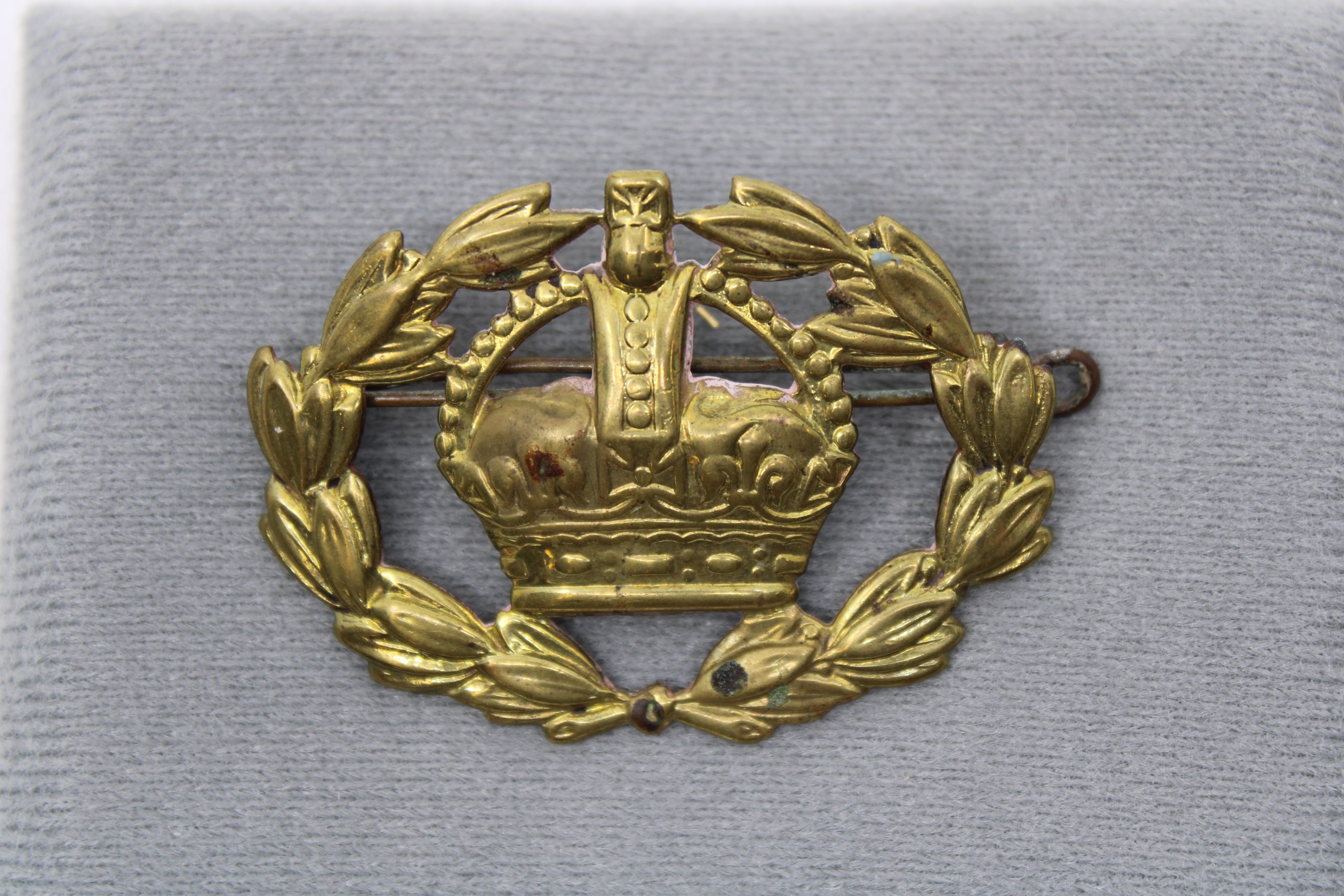 Brass rank insignia badge featuring the King’s Crown (Tudor Crown) surrounded by a laurel wreath. The badge is slightly convex in form and fitted wi
