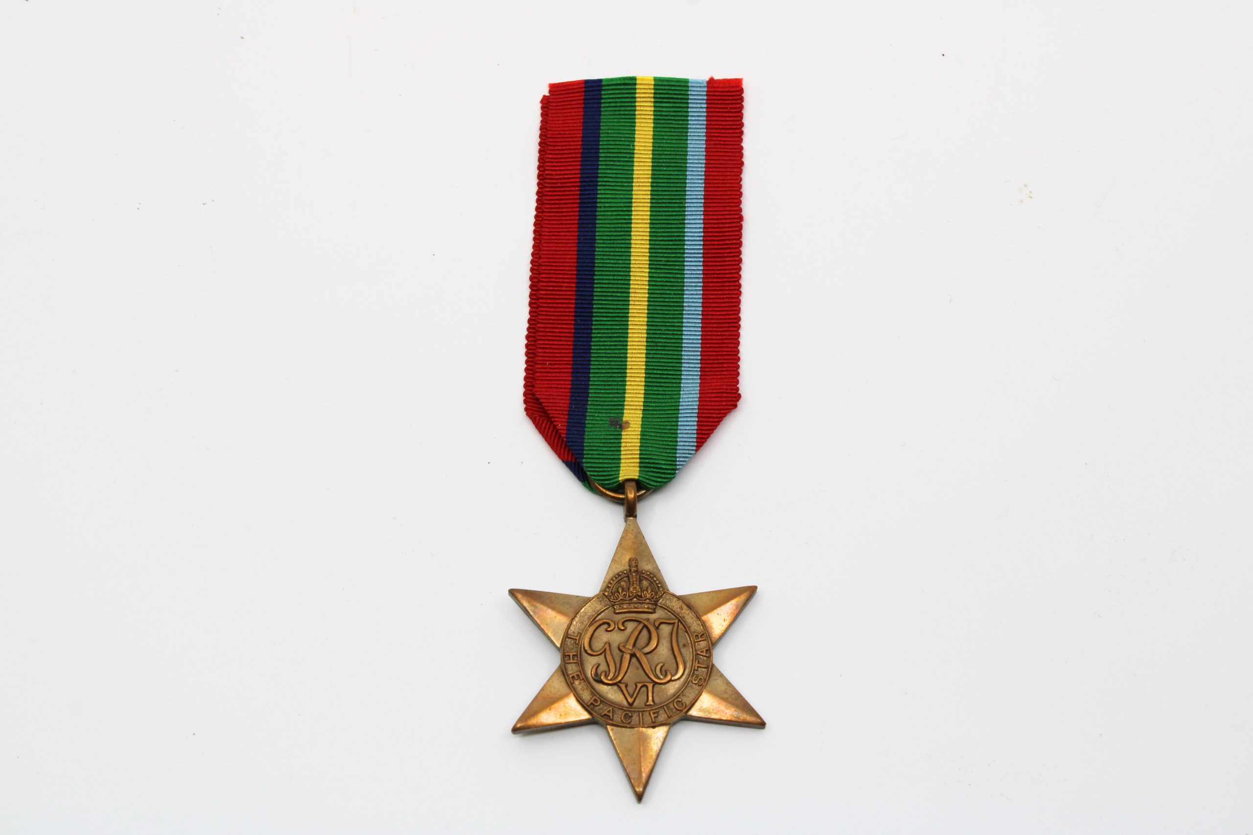 Six-pointed bronze campaign star suspended from a silk ribbon with broad green center stripe, flanked by yellow, dark blue, red, and light blue bands.