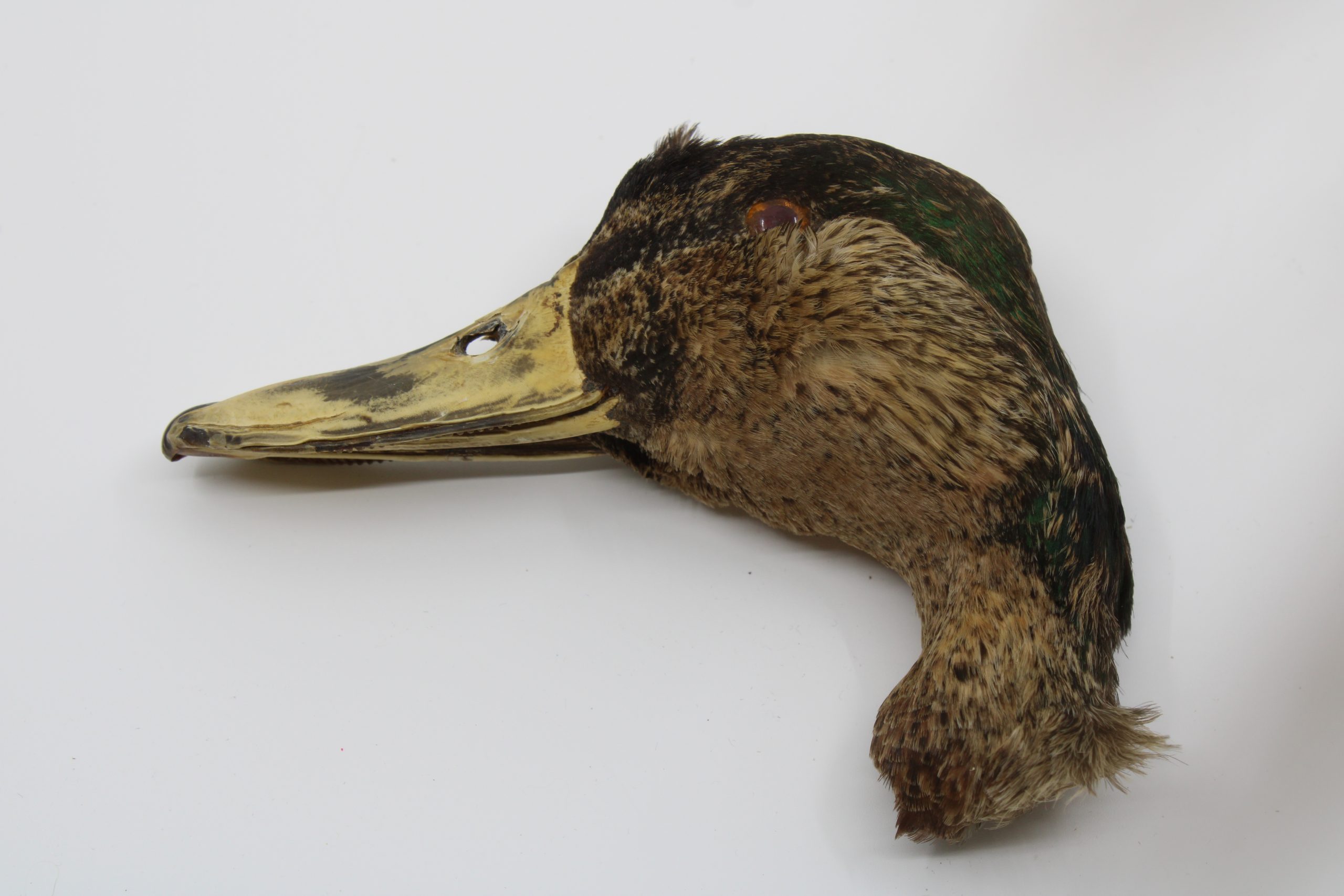 Preserved head of a duck featuring a yellowish-brown bill and mottled brown plumage with traces of iridescent green on the crown and neck. The bill is