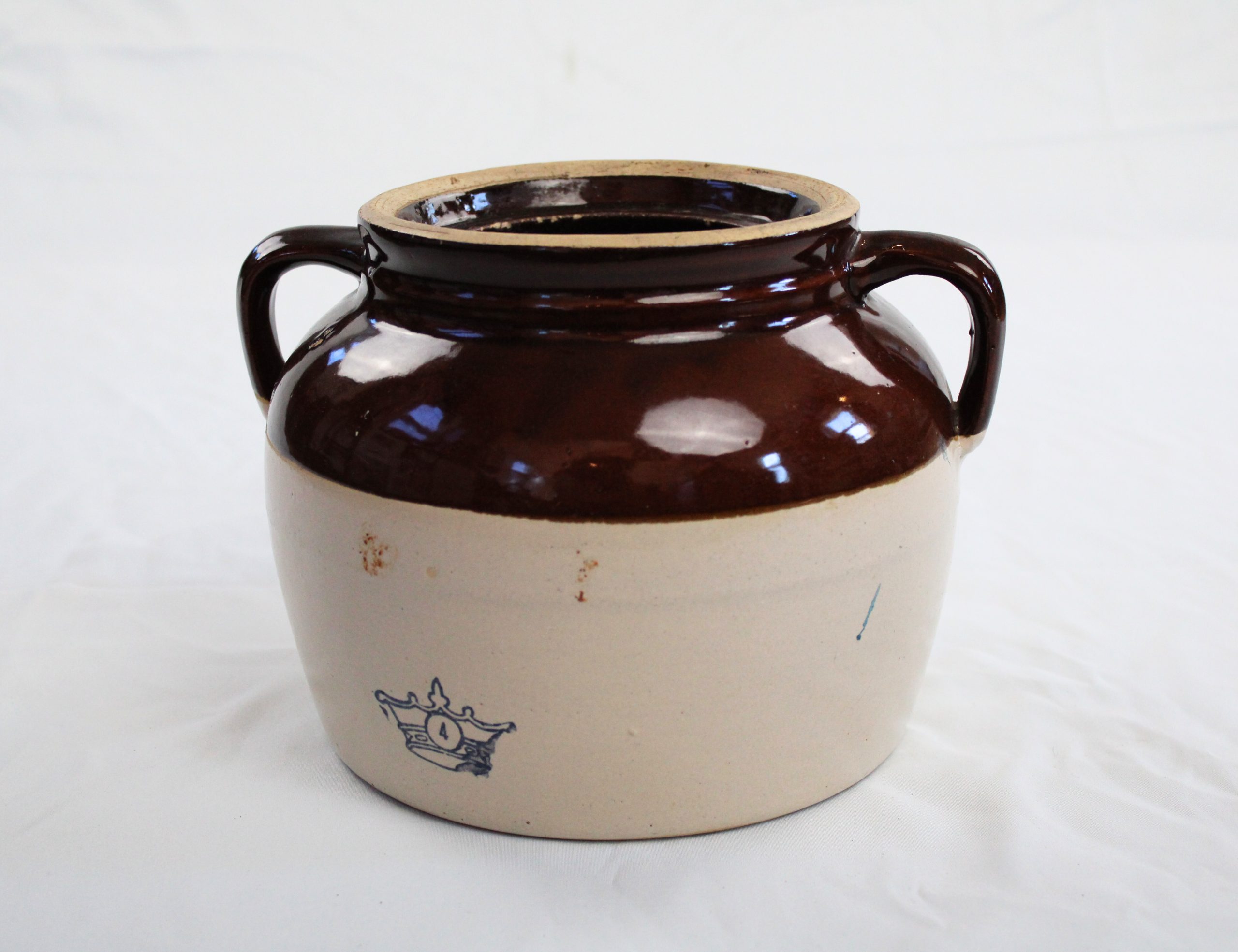 Two-handled stoneware bean crock with a wide mouth and slightly rounded body. The upper half is covered in a rich brown glaze, while the lower portion
