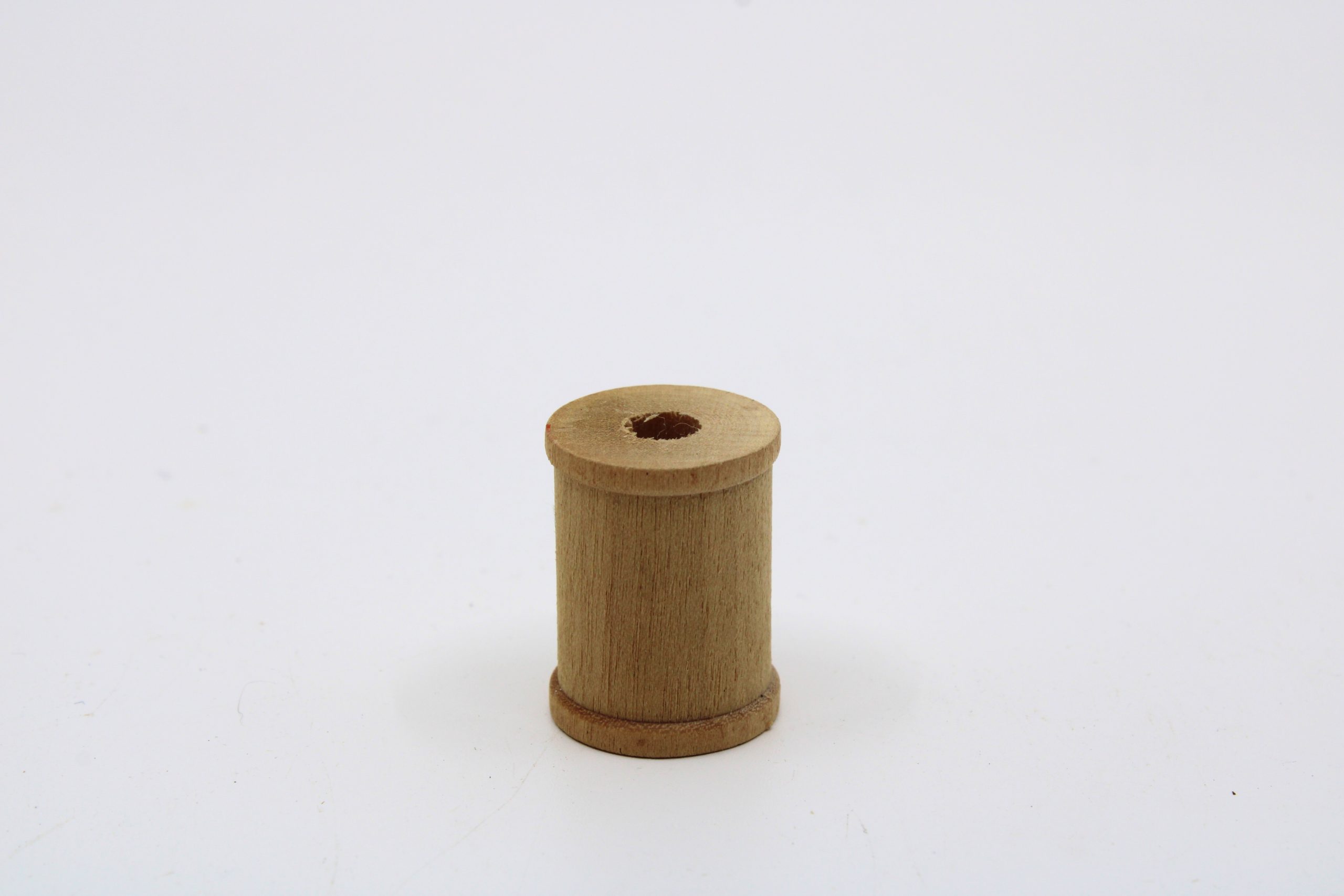 A small, cylindrical wooden spool with a central hole and slightly raised rims at both ends. The spool is plain, smooth, and unpainted, showing a ligh