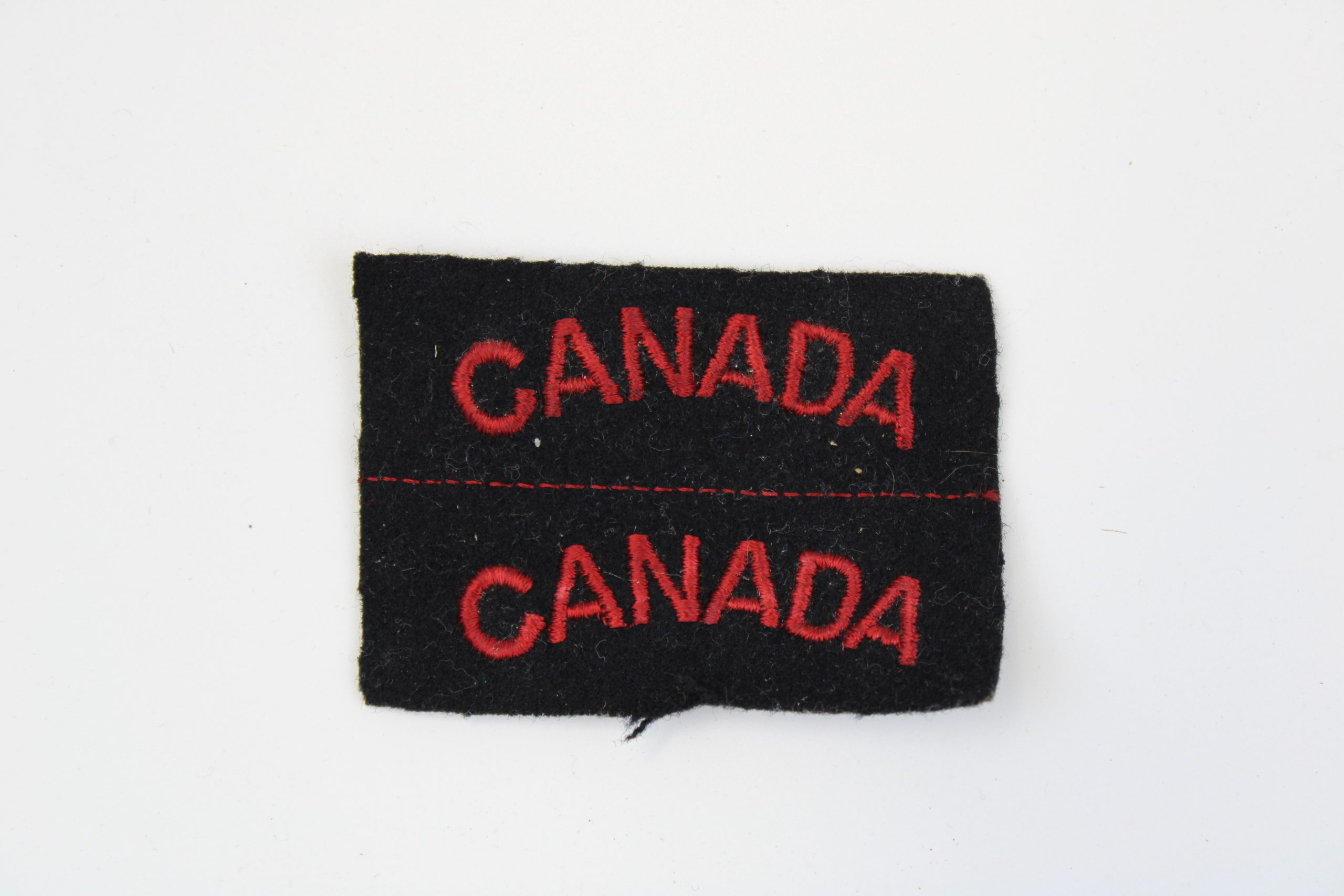 A rectangular black wool shoulder title embroidered in red thread with the word “CANADA” in capital letters. The patch features two identical titl