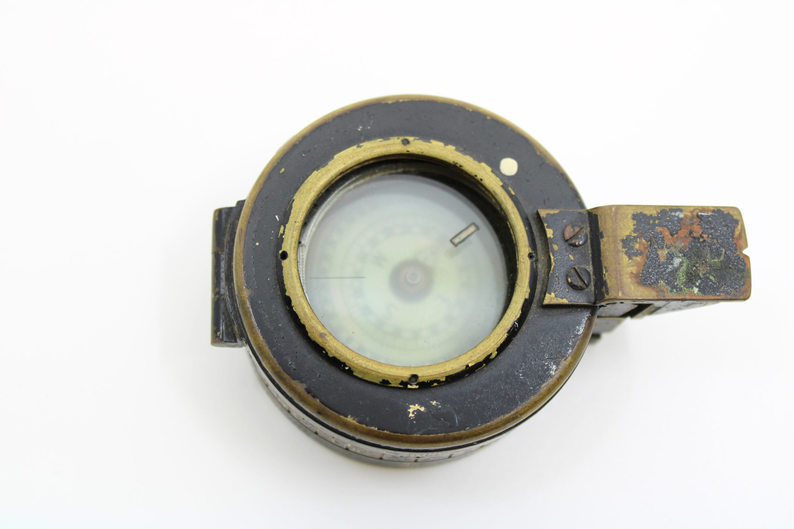A metal field compass encased in a circular black-painted brass housing with a glass-covered compass dial. The compass features a folding sighting bra