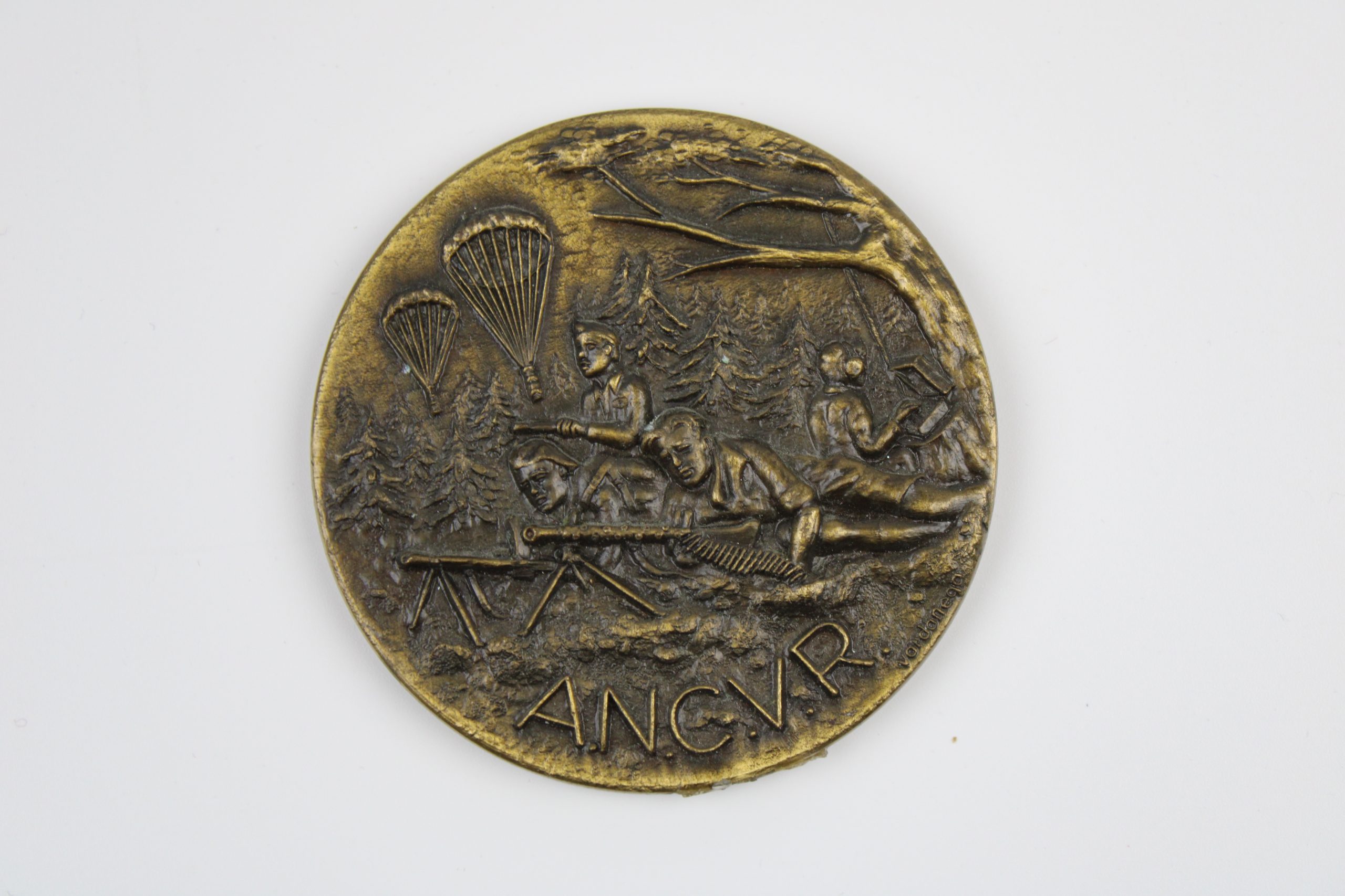 Circular bronze medal depicting a relief scene of French Resistance fighters engaged in combat within a forest, with parachutes descending in the back