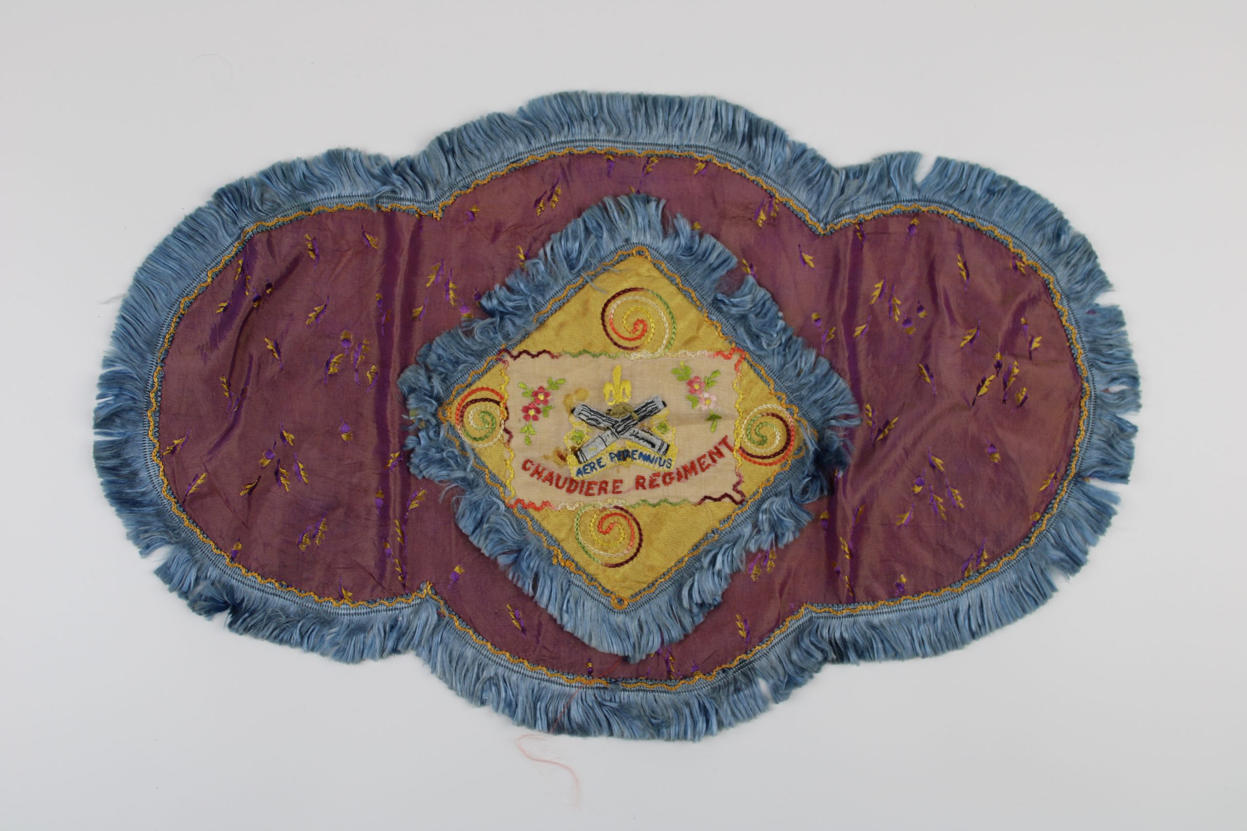 Embroidered decorative dresser scarf made of purple satin-like fabric with a blue fringe border. At the centre, a diamond-shaped yellow panel bears th