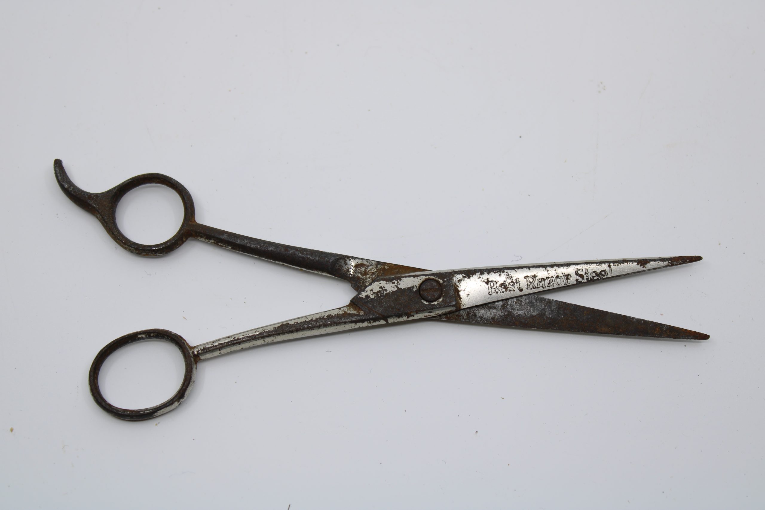 A pair of metal sewing scissors made from polished steel, showing moderate rust and patina from age. The blades are engraved with the words “Best Ra