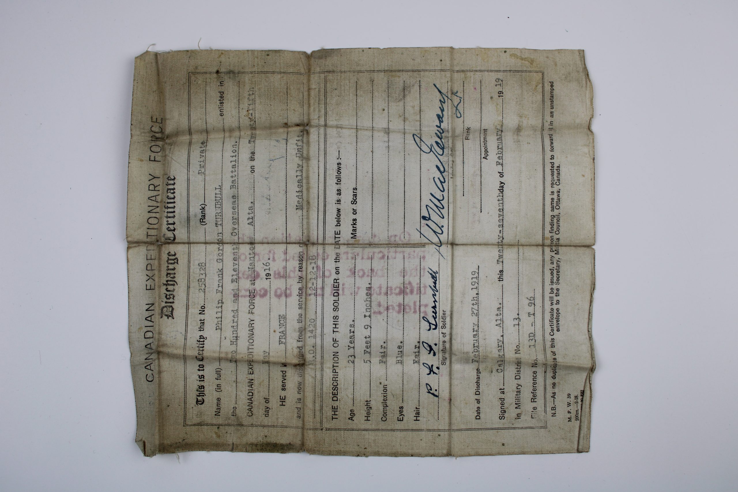 Printed discharge certificate issued to Private Turnbull (No. 283228) of the 8th Canadian Infantry (Overseas) Battalion. The document certifies his re
