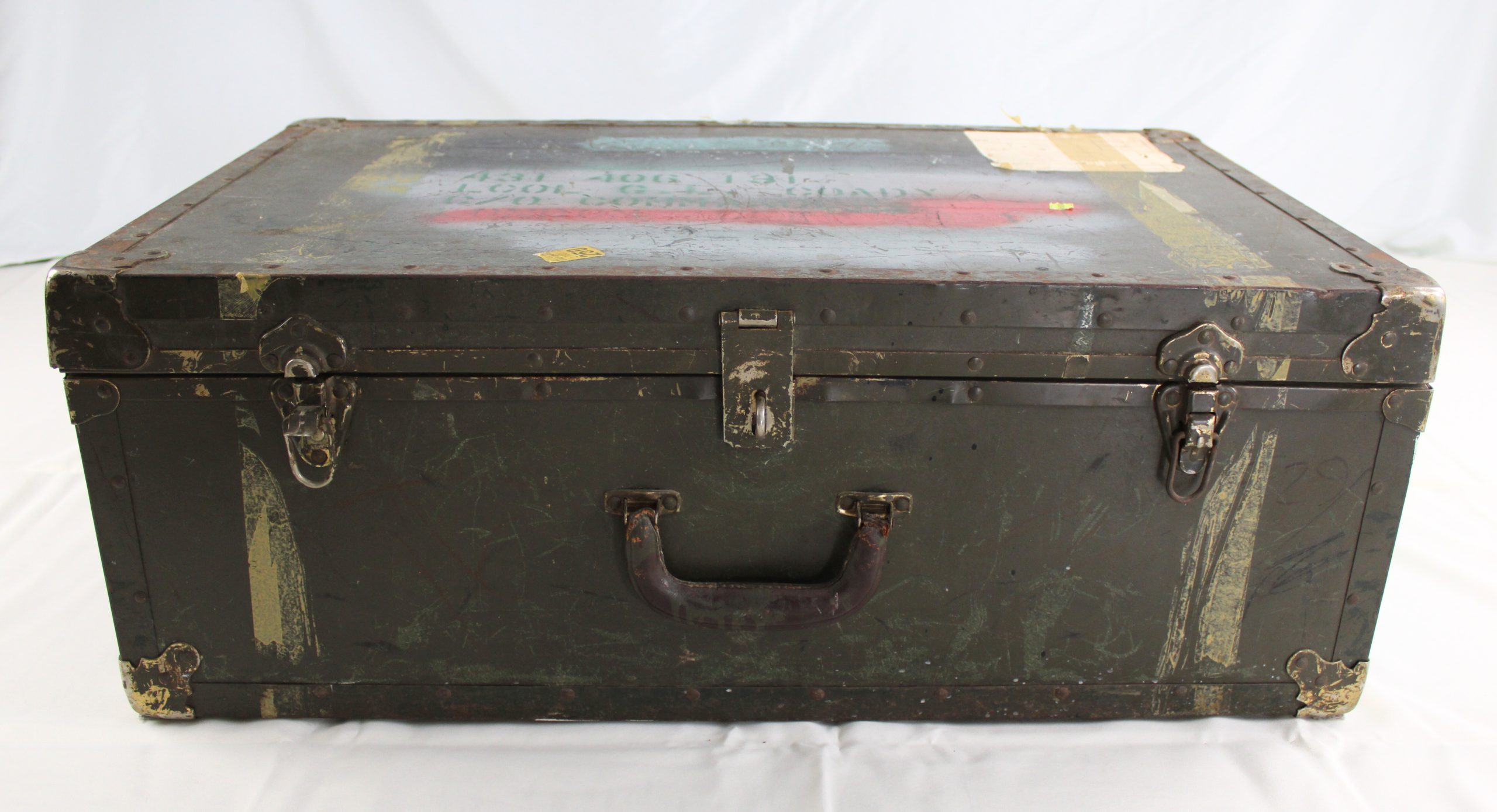 Rectangular metal military trunk painted in dark olive green, reinforced with metal corner brackets and riveted edges. The trunk features three front