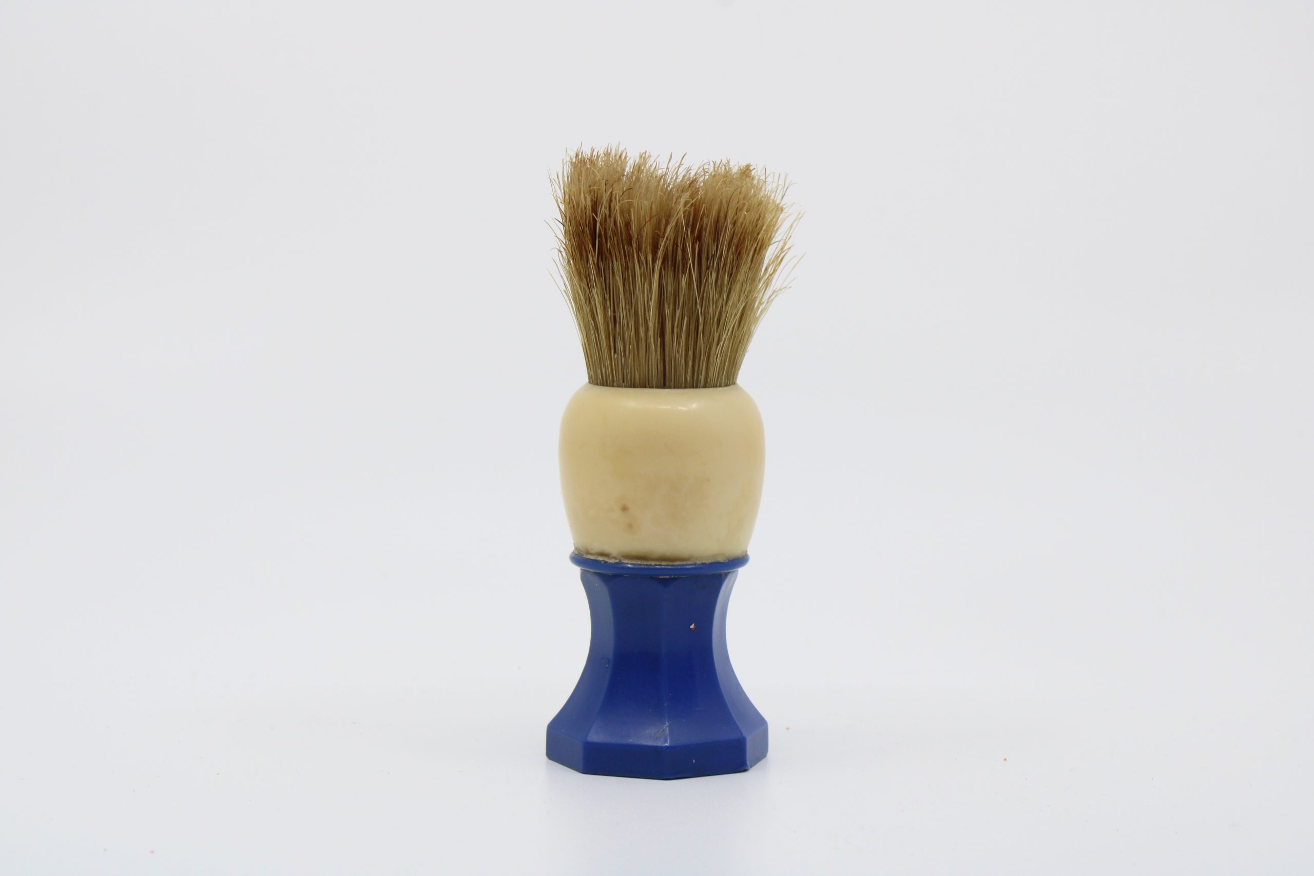 Shaving brush with a cream-colored rounded handle section and blue hexagonal base. The bristles appear to be natural hair, densely packed and slightly