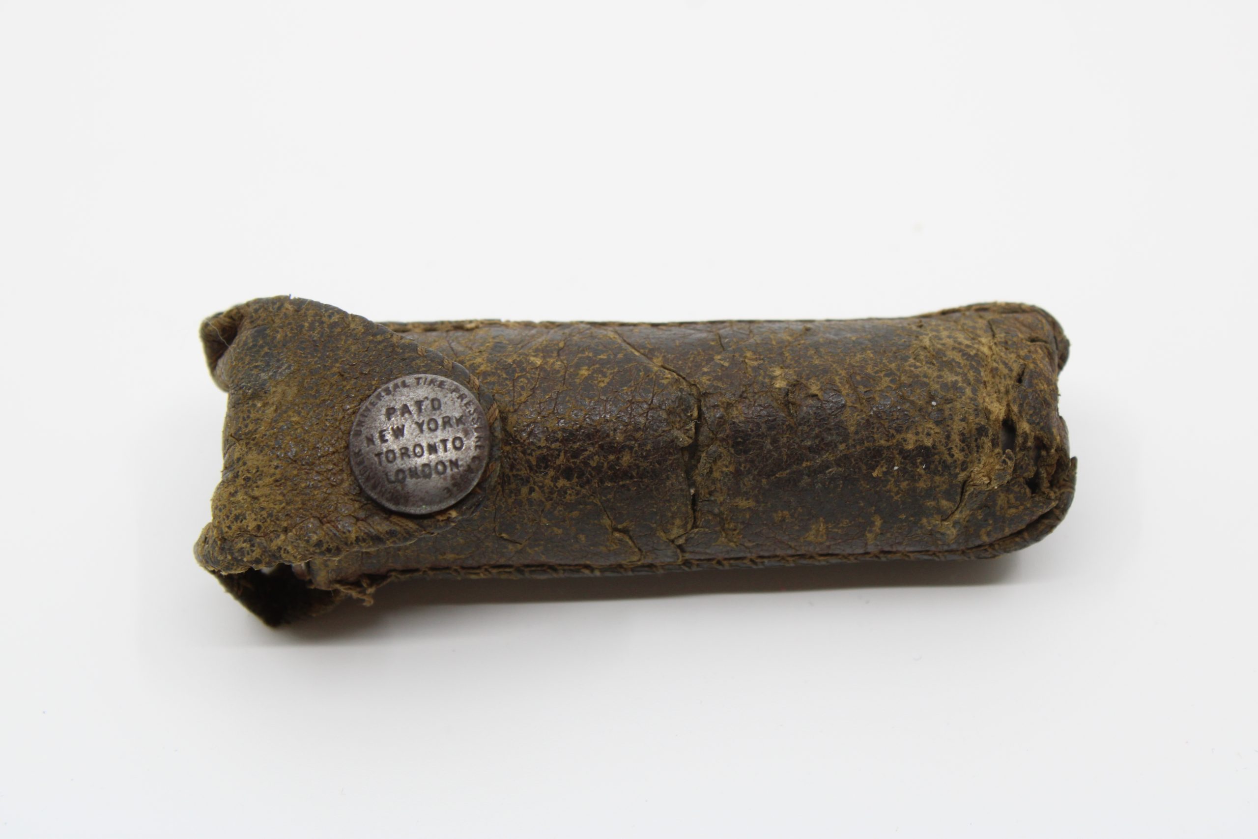 Small cylindrical metal instrument covered in a fitted brown leather sleeve. The device consists of a tubular body with a pressure indicator inside (n