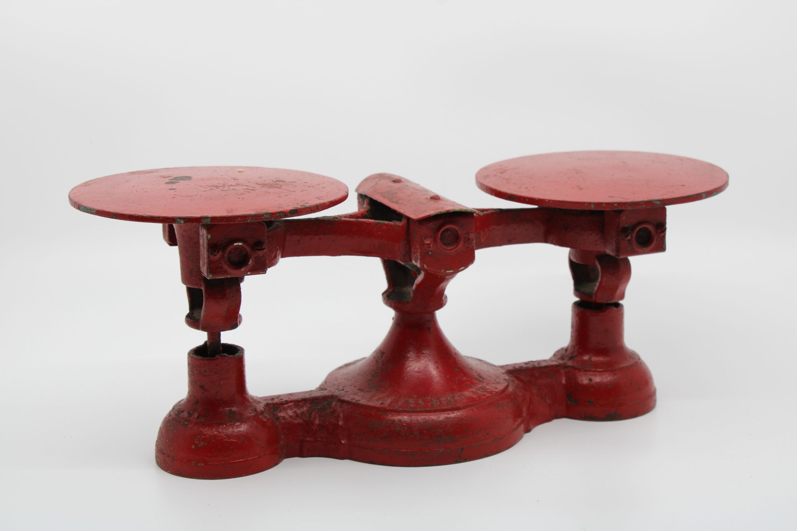 A red-painted cast iron balance scale with two round weighing plates and a central fulcrum base.