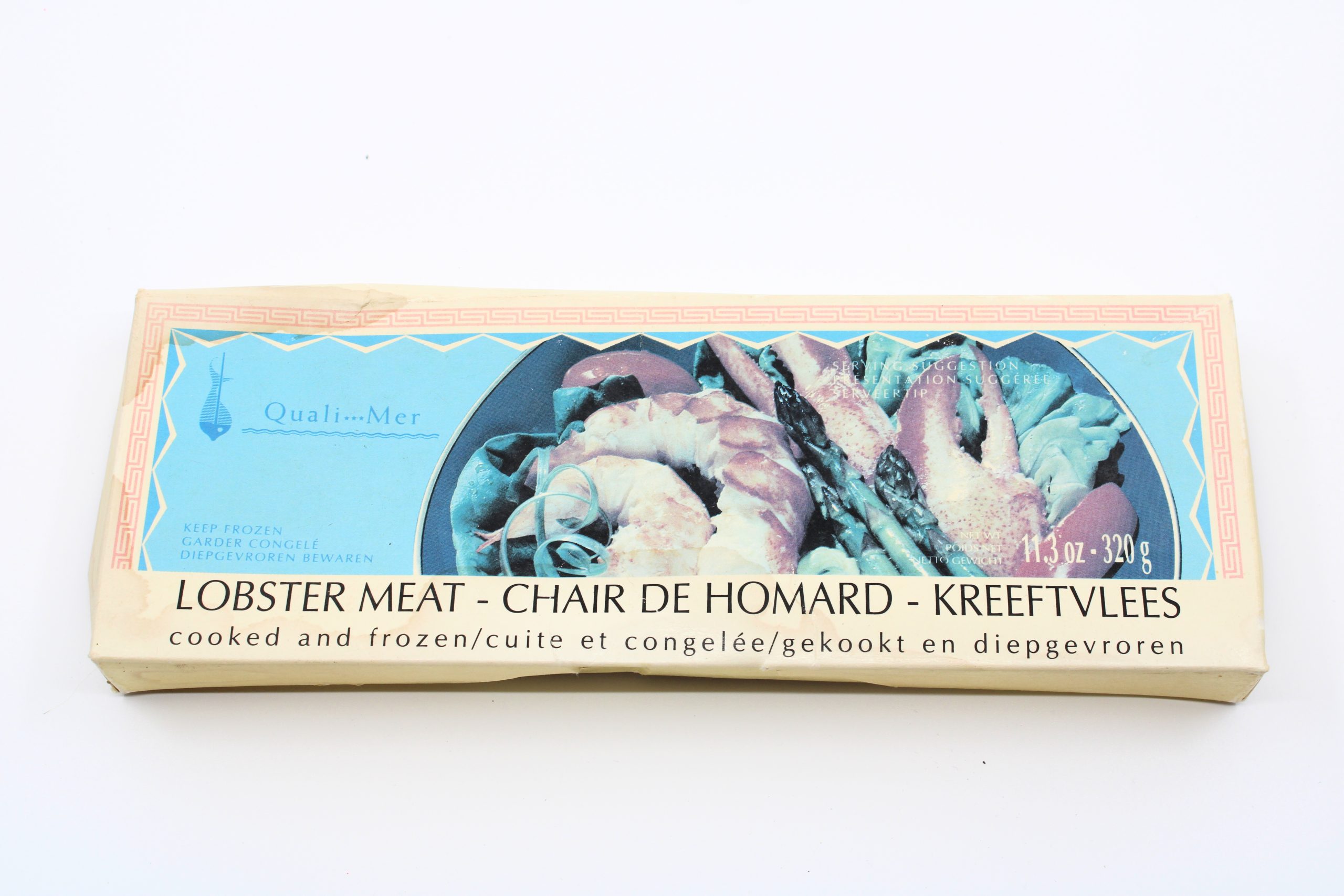 A rectangular cardboard box designed for frozen lobster meat produced under the Quali-Mer brand.