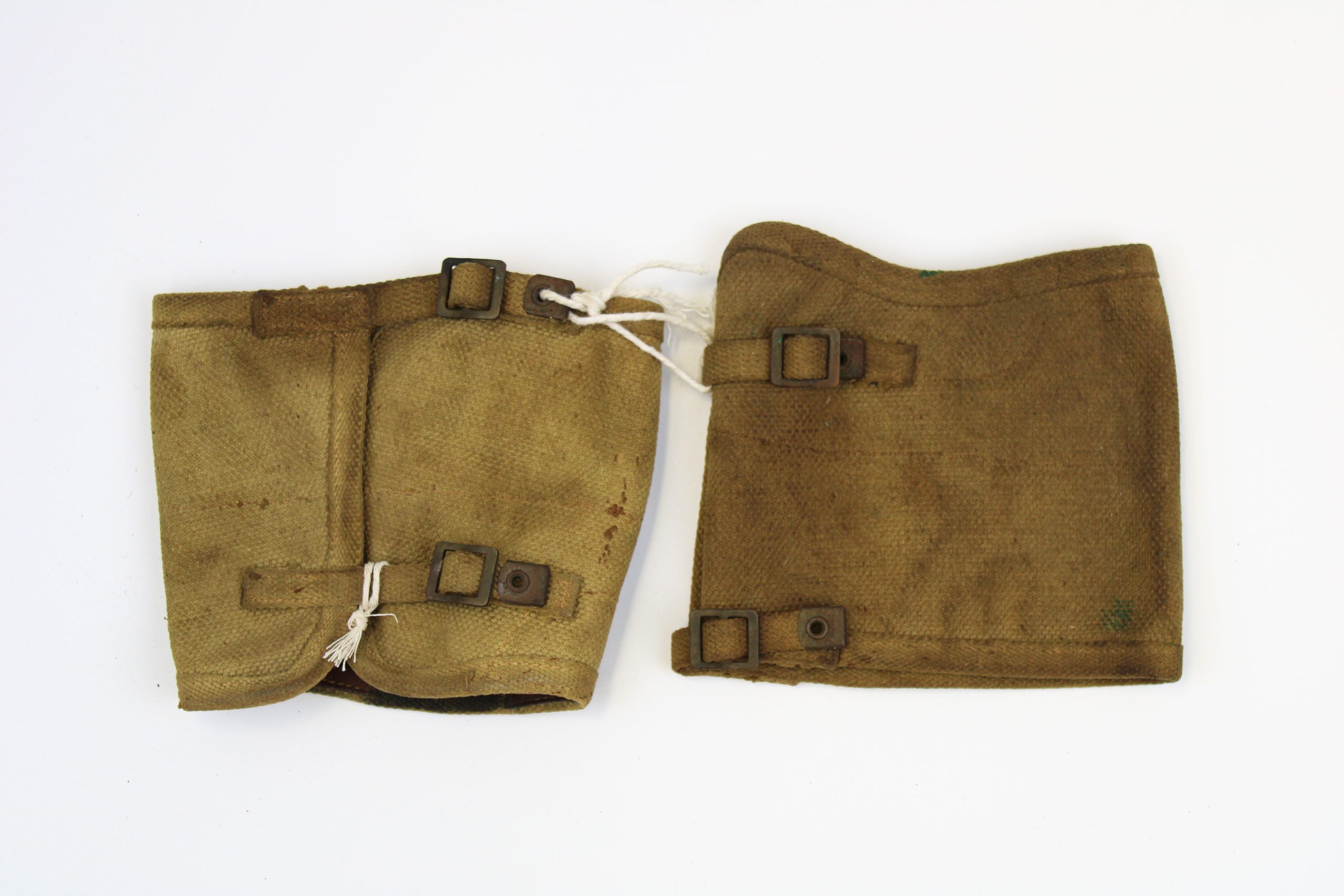 Pair of canvas gaiters made from tightly woven khaki cotton, each secured with two brass buckles and leather reinforcement tabs. The interior features