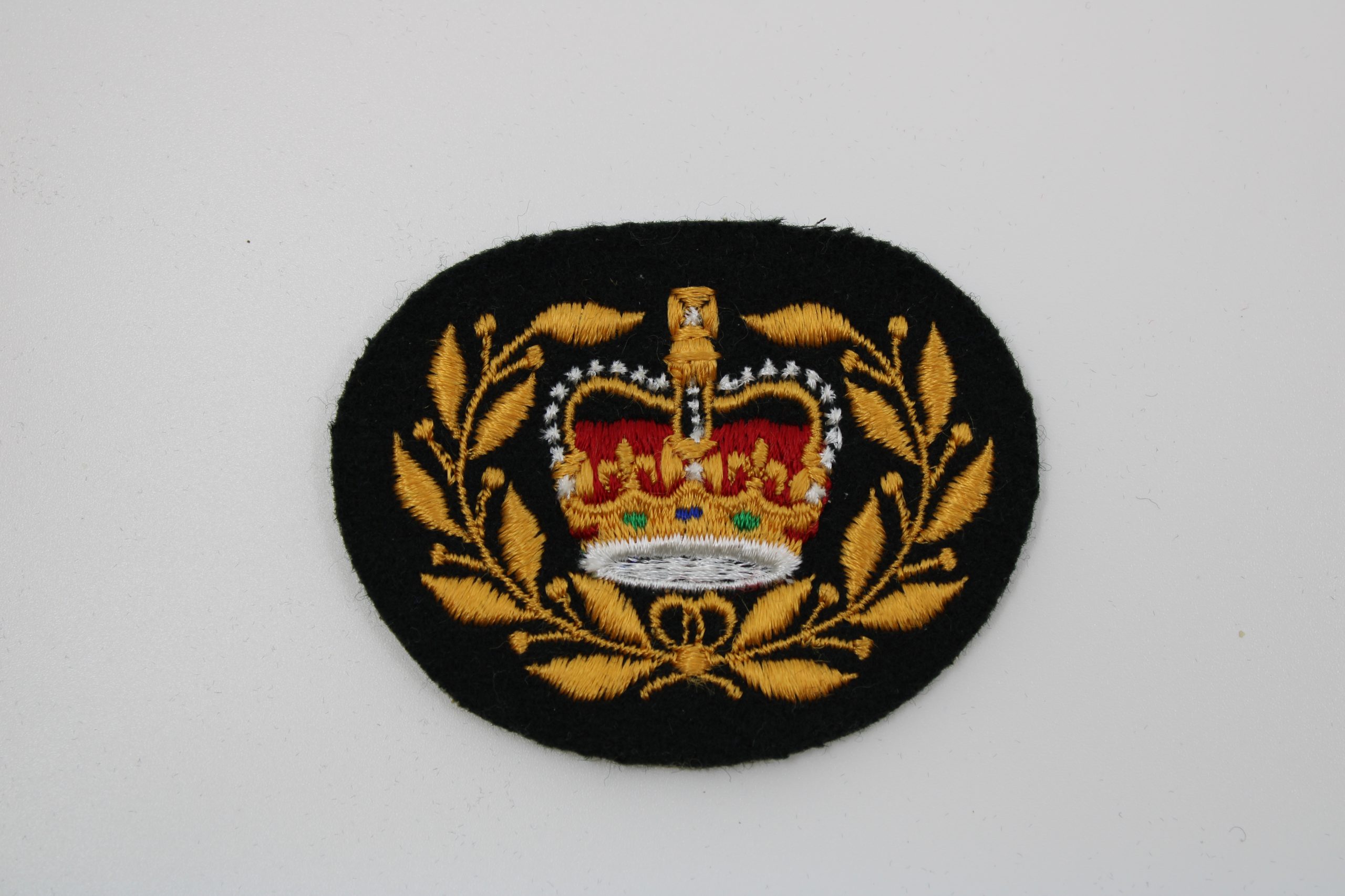Crown inside a circle of gold leaves on a black background. Master warrant officers often hold senior leadership roles such as school sergeant majors