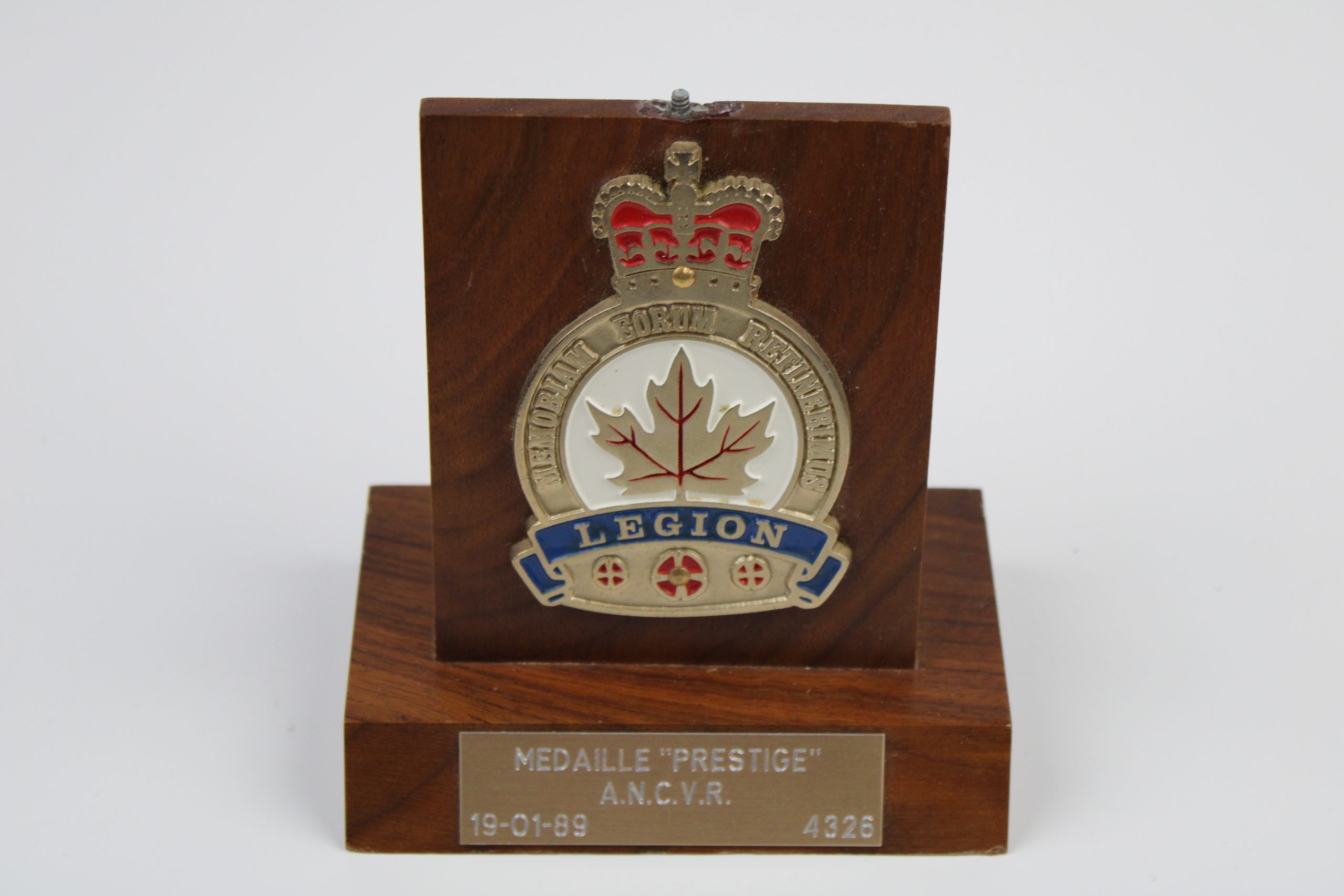 Rectangular wooden display plaque featuring a mounted metal emblem of the Royal Canadian Legion. The central design includes a red and gold crown at t