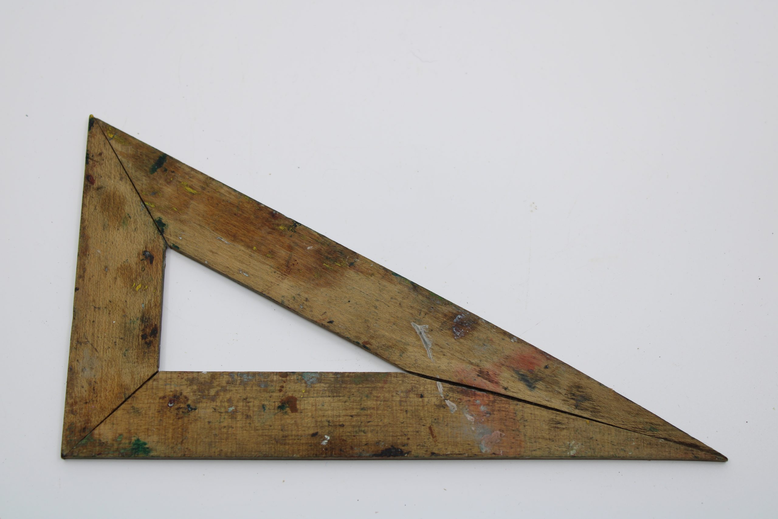 A right-angle wooden triangle used for measurement and drafting. The tool is handmade or workshop-produced, with a 90° angle and two equal-length sid