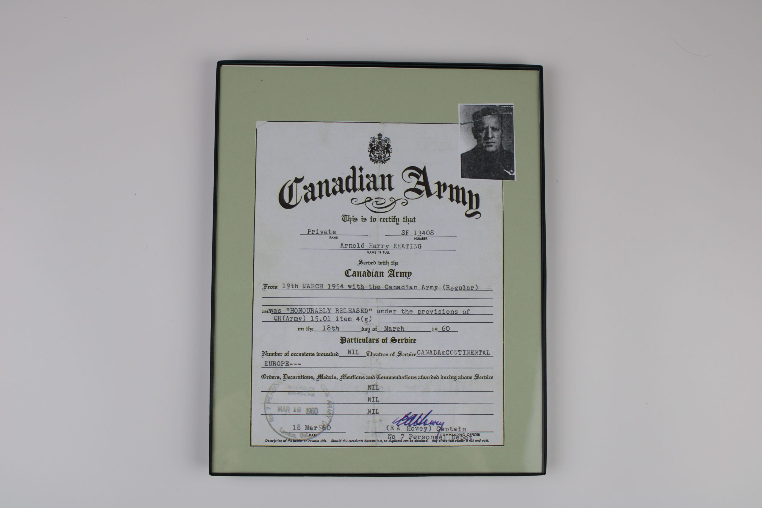 Framed black-and-white Canadian Army service certificate for Private Arnold Harry Keating (SP 13408). The document confirms his service with the Canad