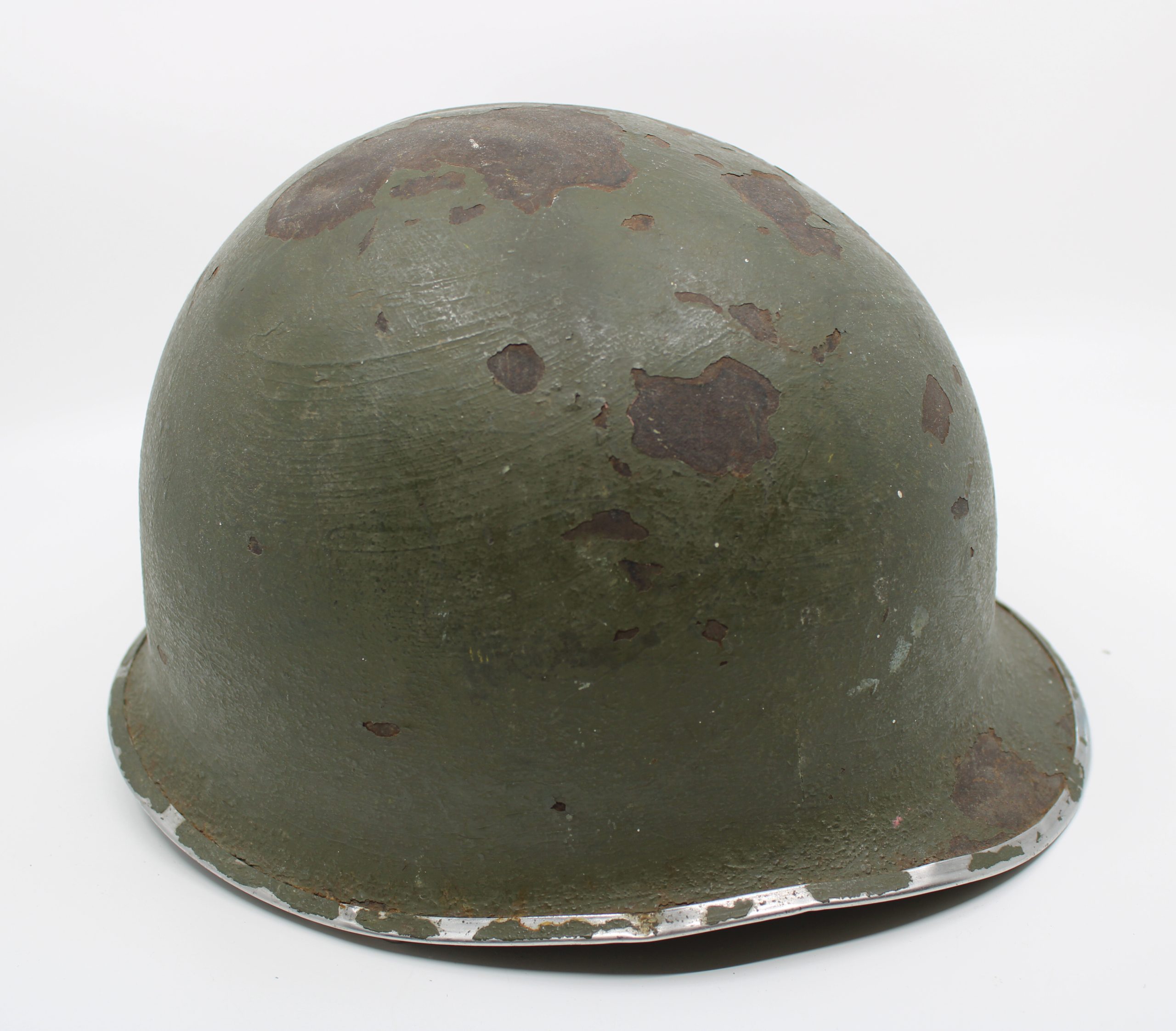 Standard issue U.S. M1 steel combat helmet, painted in matte olive drab green. The helmet shell features a rimmed edge, front seam, and a single canva