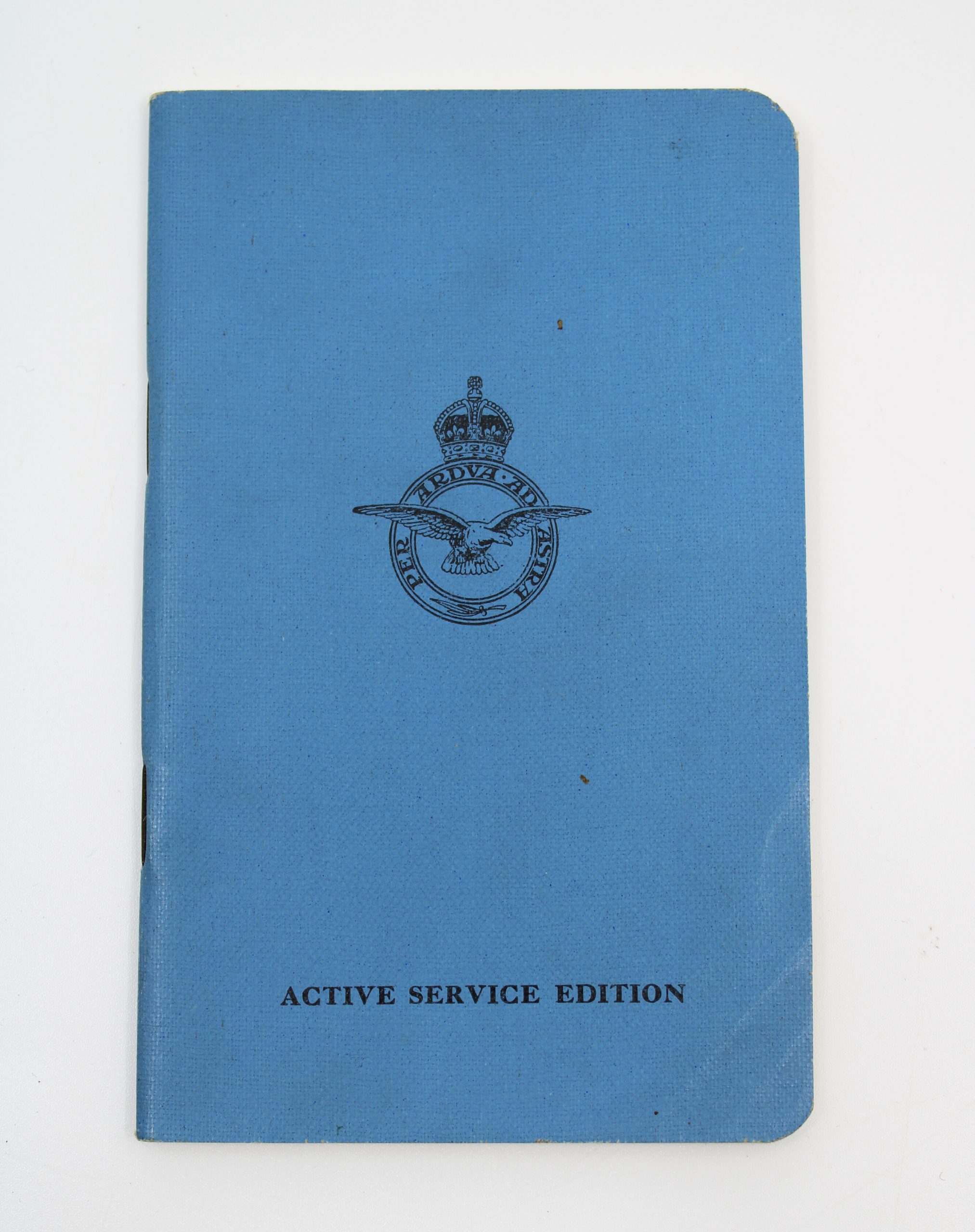 A small pocket-sized New Testament booklet bound in light blue paper covers, bearing the Royal Air Force insignia and the words “Active Service Edit