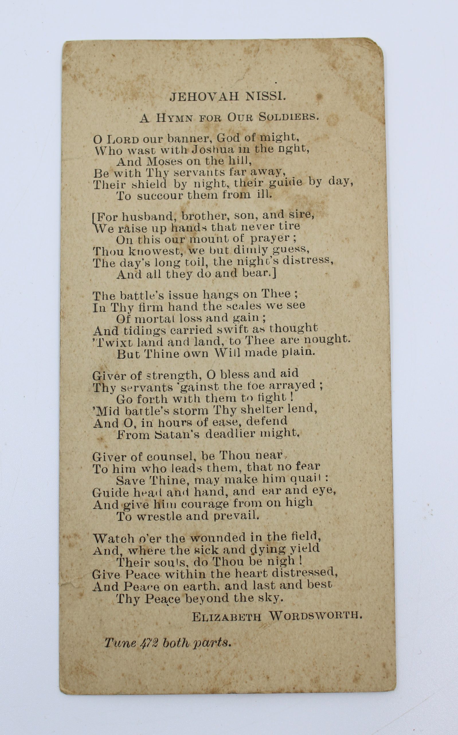 A single printed hymn card titled “Jehovah Nissi. A Hymn for Our Soldiers.” The text is printed in black ink on cream-colored cardstock, now aged