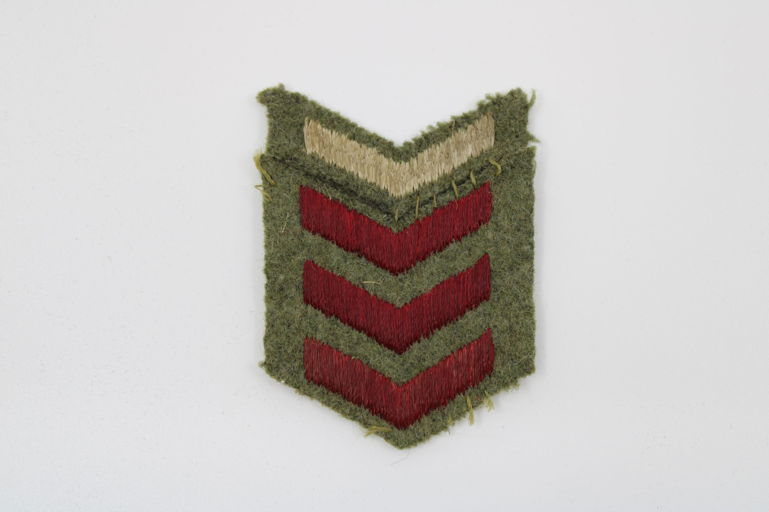 Olive green wool patch featuring three red chevrons with one beige chevron above. The red chevrons denote years of overseas military service, while th