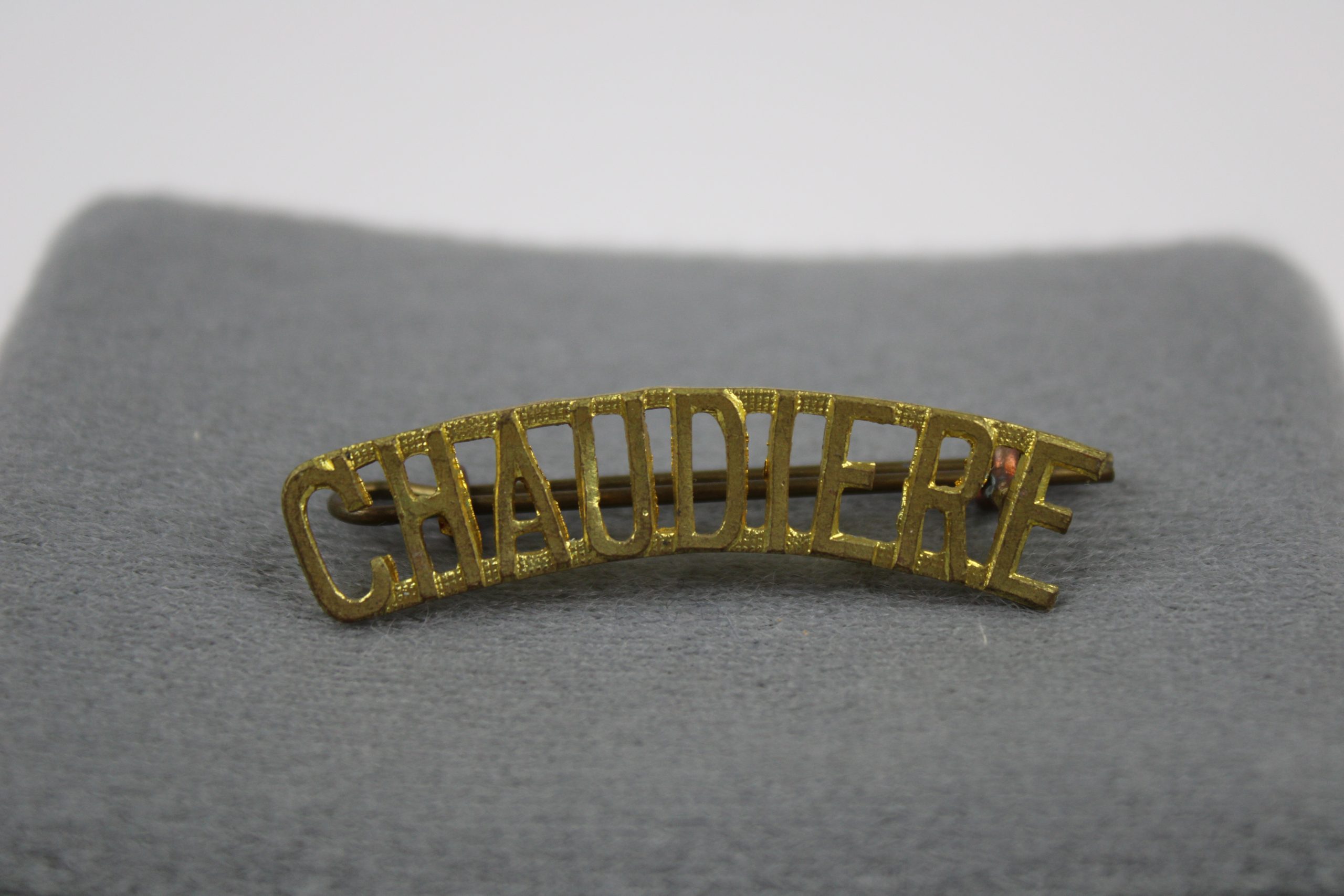 Curved brass shoulder title pin reading “CHAUDIÈRE” in openwork block letters. The back features two attachment lugs for fastening to a uniform s