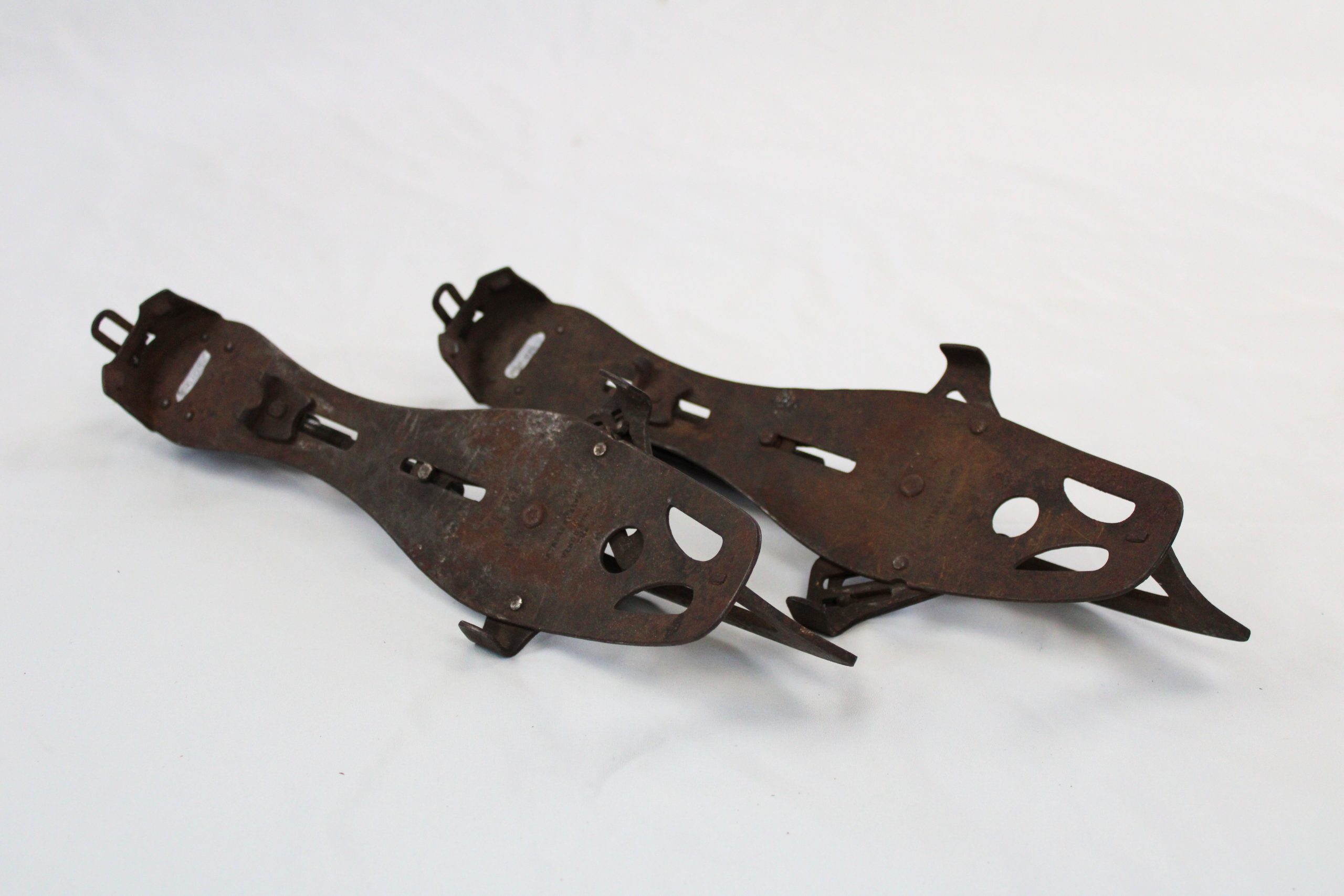 A pair of metal strap-on ice skates, commonly known as club skates, made entirely of forged steel. Each skate consists of a flat metal base shaped to