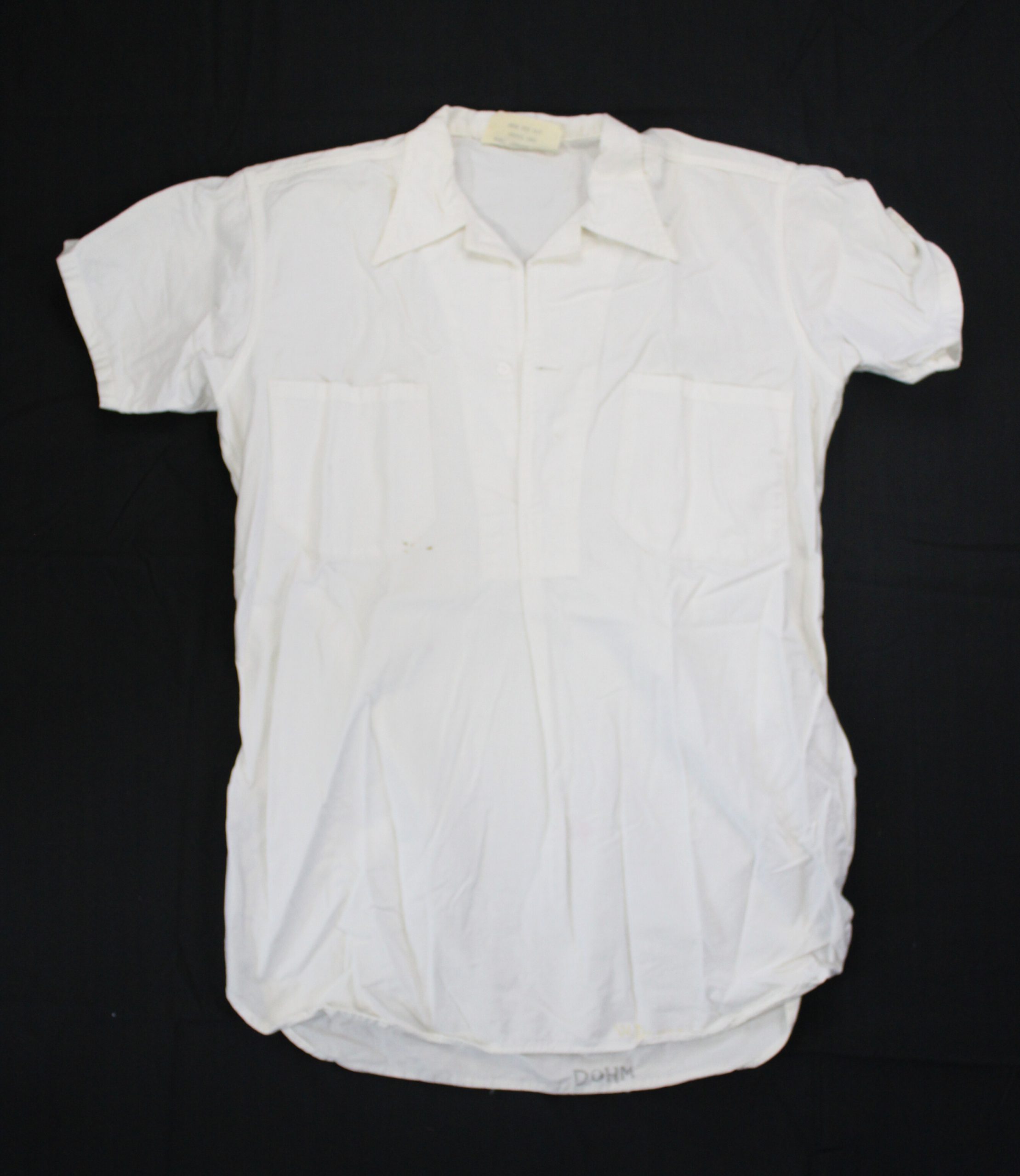 White short-sleeved cotton pullover shirt featuring a one-button front closure and V-neck collar. The shirt includes two chest pockets and two short s
