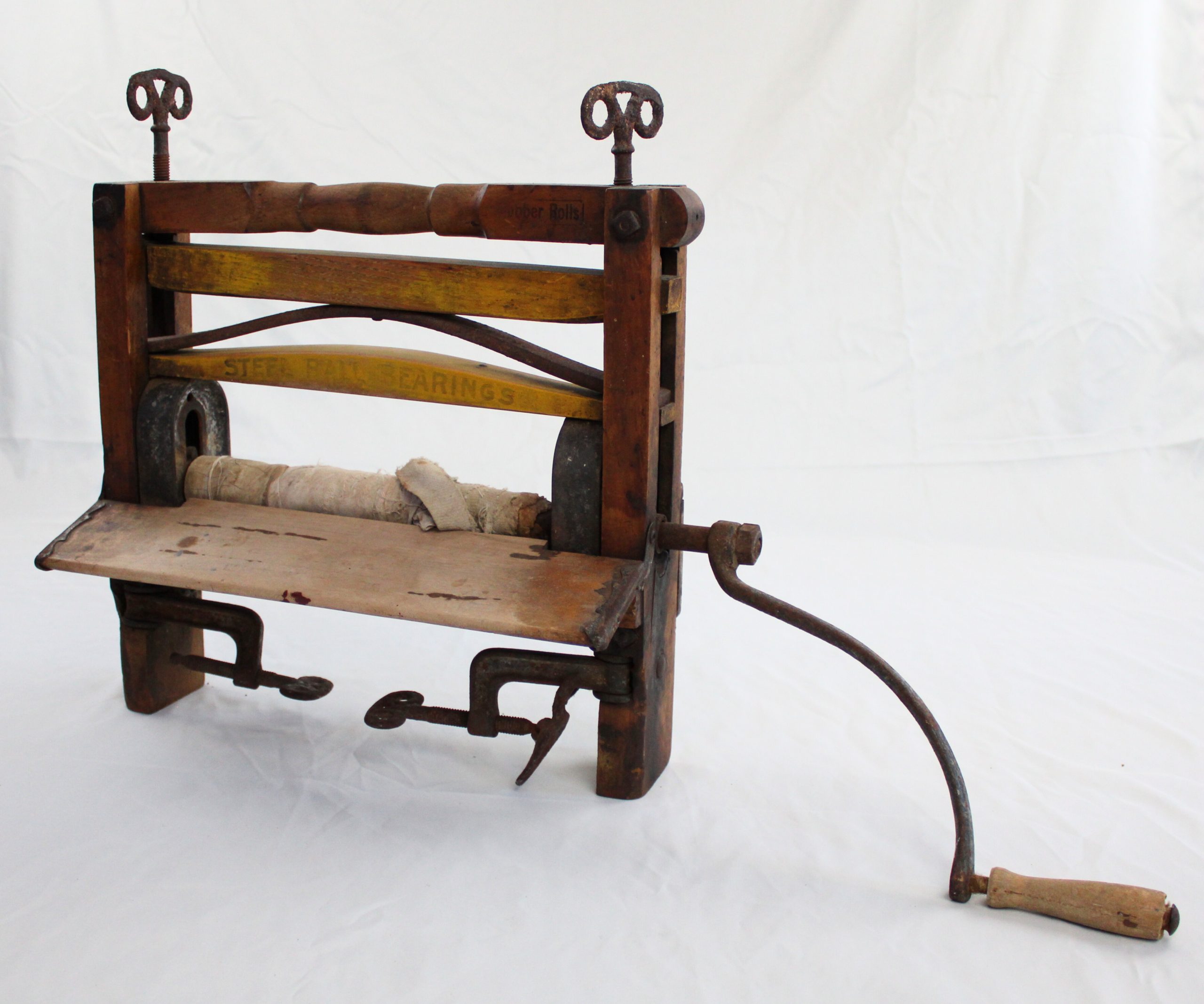 A manual clothes wringer composed of a wooden frame, two cylindrical rollers, and a hand-crank mechanism. The wringer features metal adjustment knobs