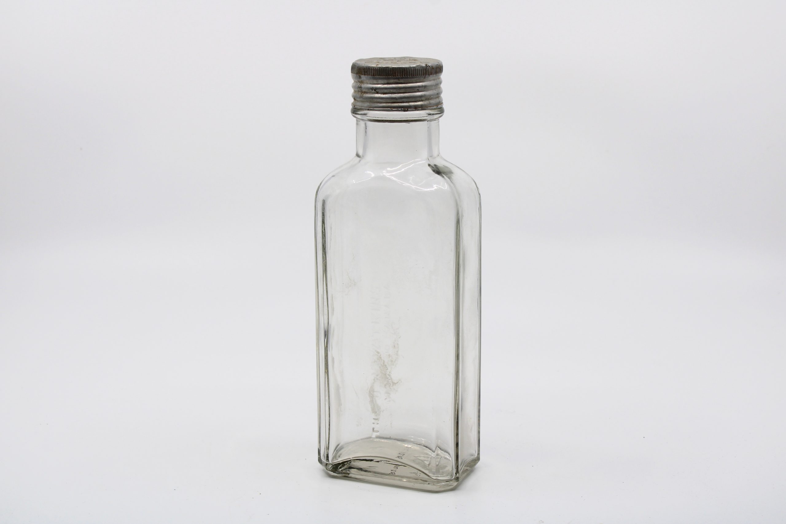Clear rectangular glass bottle with rounded shoulders and beveled vertical edges.