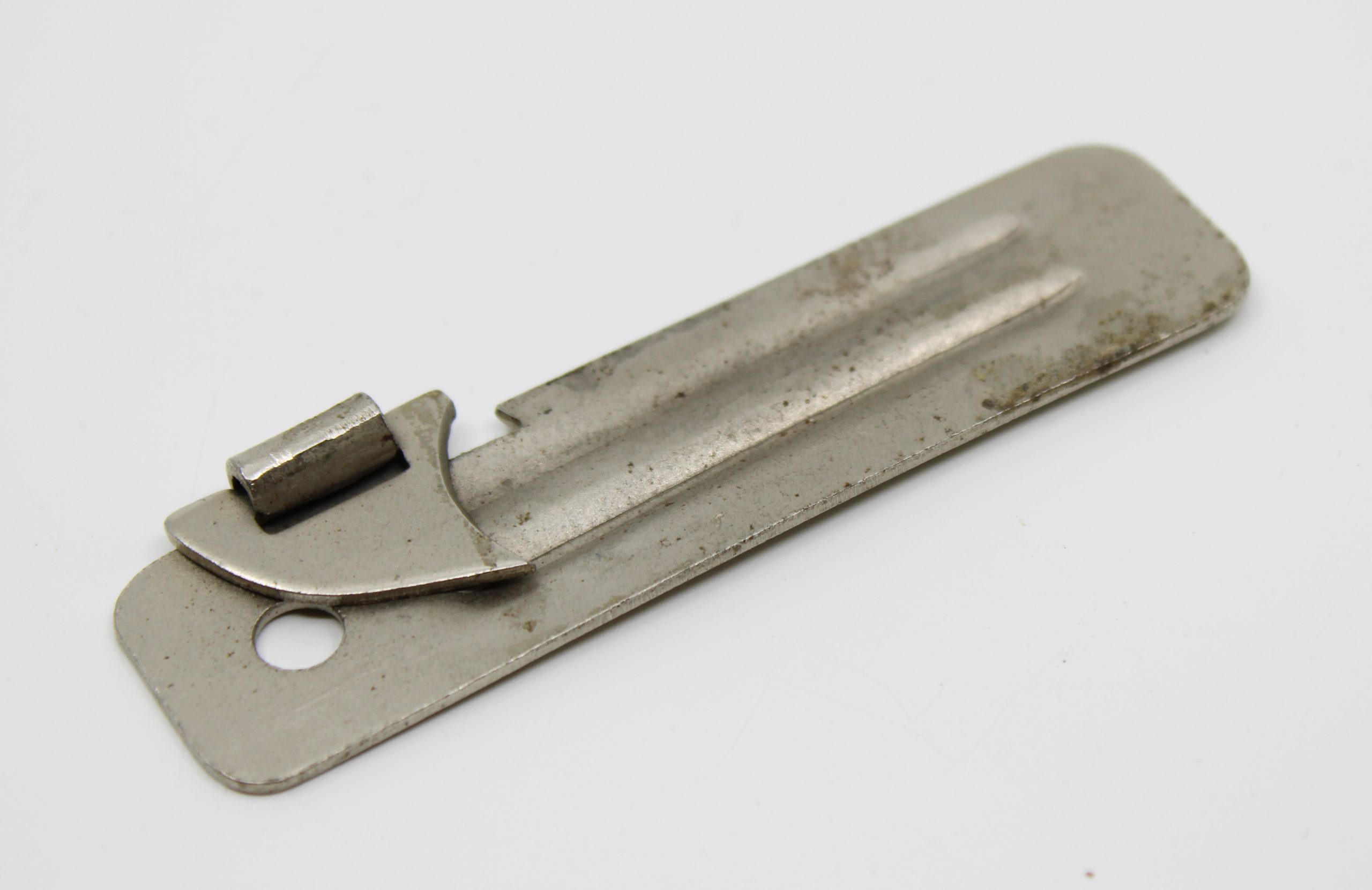 Small rectangular metal can opener made of steel with a folding cutting blade and a single round hole at one end. The surface is unpainted, showing mi