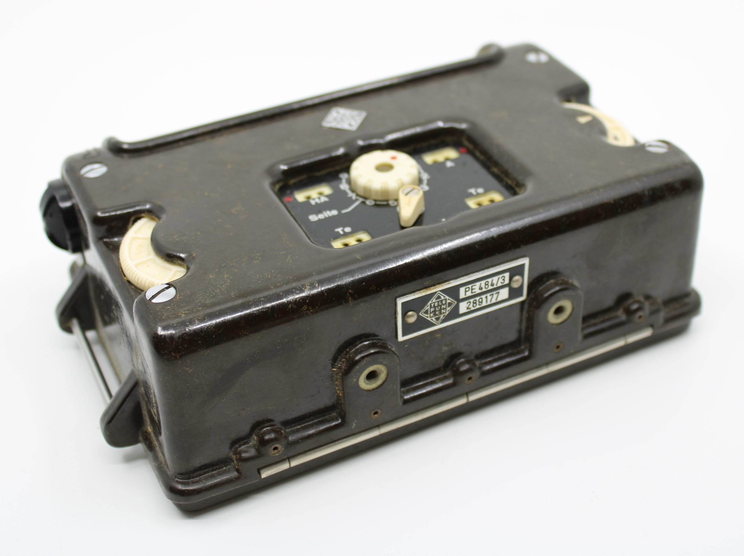 Compact radio receiver or control unit, rectangular in shape and enclosed in a dark brown Bakelite housing. The front panel features a horizontal freq