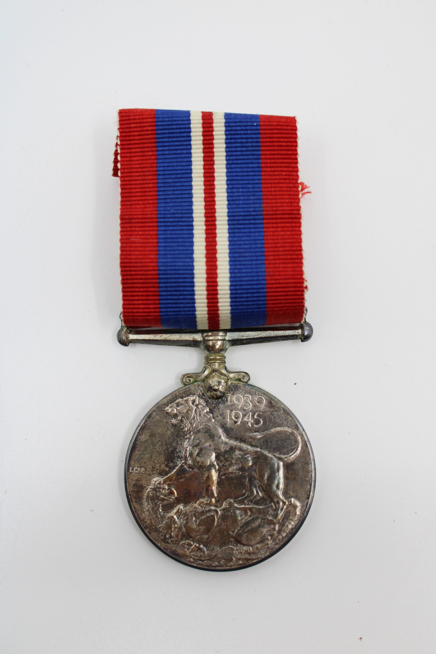 Circular silver medal suspended from a silk ribbon composed of narrow red edges, narrow white stripes, and a broad central band of blue. The obverse f