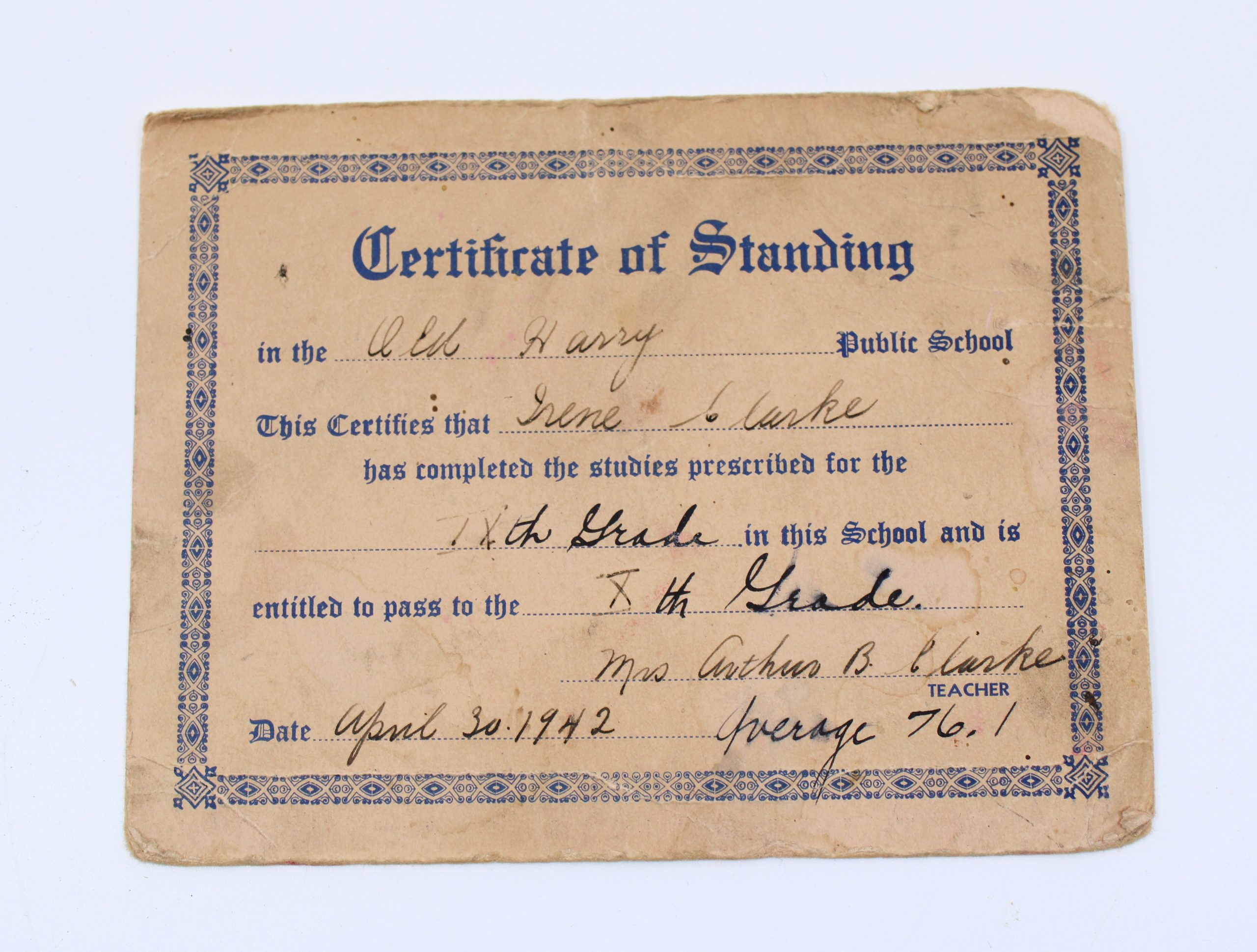 Two handwritten and printed school documents belonging to Irene Clarke, a student at Old Harry Public School, Grosse-Île.